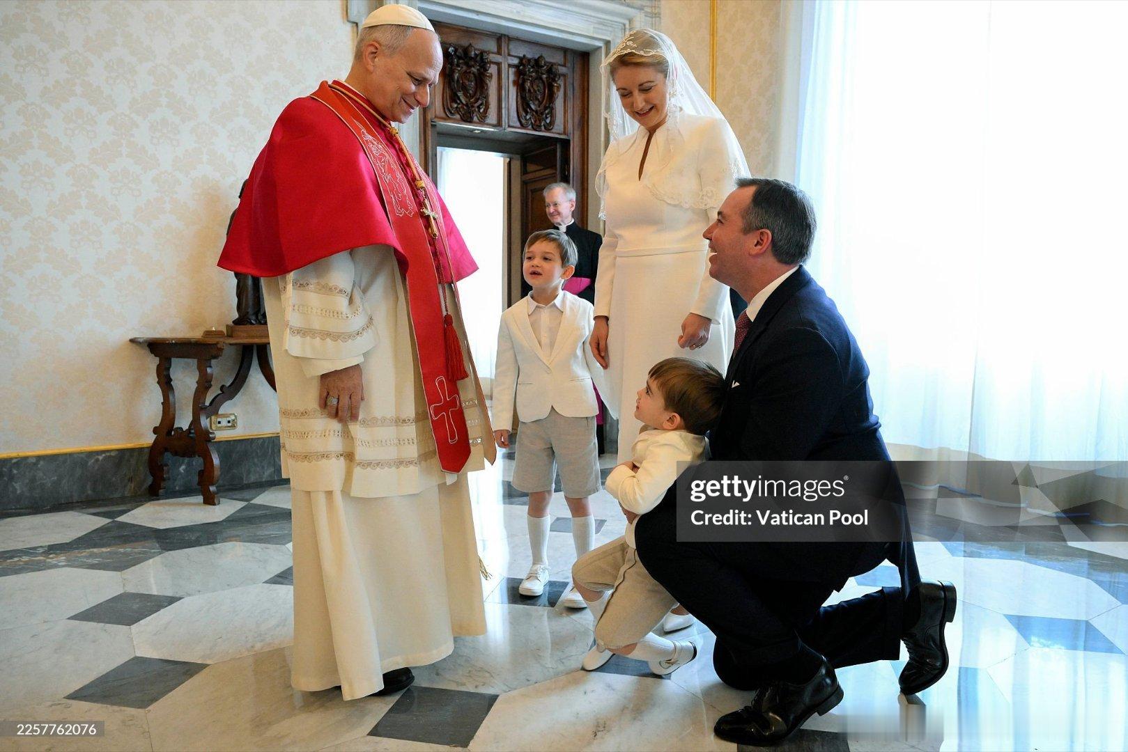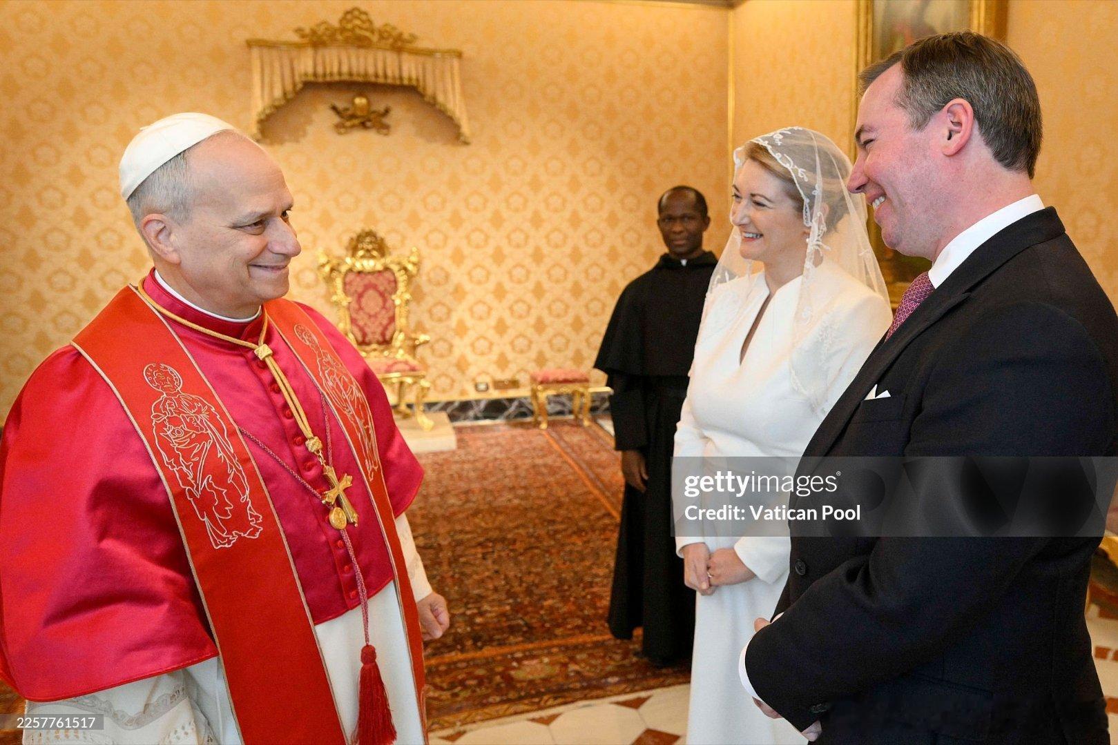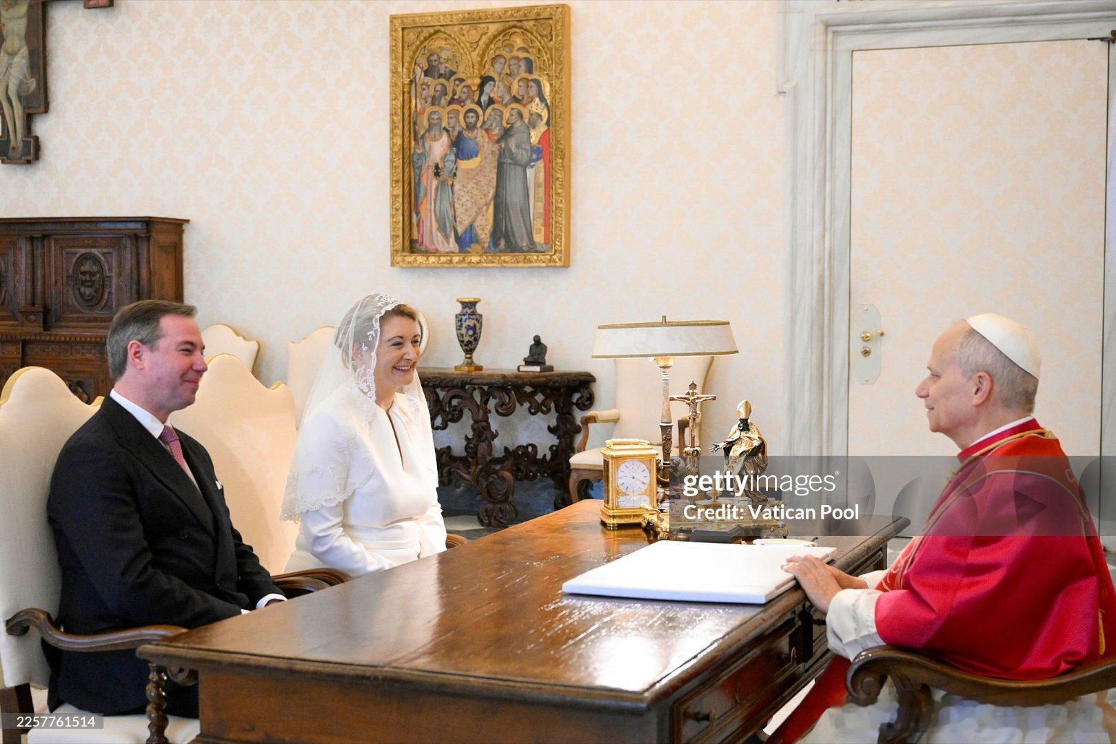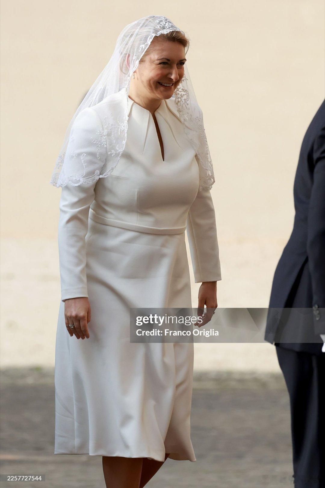 新闻 2026.1.23 卢森堡大公一家访问梵蒂冈并觐见教皇利奥十四世,这是卢森堡大公纪尧姆五世即位后首次访问梵蒂冈,斯蒂芬妮第一次穿白衣觐见(见教皇的穿衣规则:网页链接)。PS:斯蒂芬妮上哪扯的蚊帐当白纱呦。