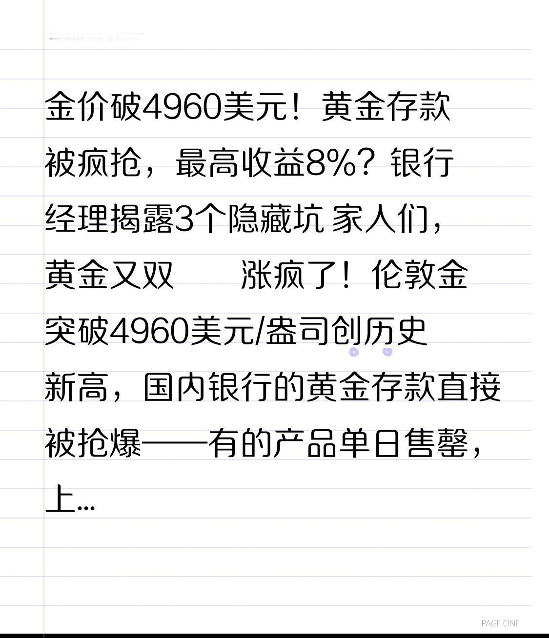 金价破4960美元!黄金存款被疯抢,最高收益8%?银行经理揭露3个隐藏坑 家人们,黄金又双叒叕涨疯了!伦敦金突破4960美元/盎司创历史新高,国内银行的黄金存款直接被抢爆——有的产品单日售罄,上市公司扎堆申购,大爷大妈排队抢额度,甚至有人把大额存单取出来转投黄金存款,说能拿8%高收益!但这里藏着3个致命坑,90%的人都没看清,今天一次性说透,别跟风亏了钱! 很多人以为黄金存款是“稳赚不赔的黄金理财”,这可就大错特错了!这其实是挂钩黄金的结构性存款,看似是存款,实则藏着投资陷阱。先说说大家疯抢的原因:一方面金价开年涨了11%,大家都想蹭牛市红利;另一方面银行定期存款利率跌破1%,而黄金存款最高标称8%收益,一对比简直像捡钱。但关键转折来了:这高收益根本不是随便能拿的! 就拿交行一款热门产品来说,标称年化0.5%-3.2%,但要拿3.2%最高收益,得满足两个条件:观察期内金价涨幅不超过6%,且到期时金价比买入时涨。如果金价涨超6%,收益直接降到1.7%;要是金价下跌,就只能拿0.5%的保底收益。更狠的是外资银行的产品,虽然最高能到8%,但起购门槛要8万美元,还不保本,搞不好本金都要亏! 第二个坑是“流动性陷阱”。黄金存款和普通存款不一样,基本不能提前支取,期限从7天到1年不等。有网友买了半年期产品,中途急用钱想取,银行说只能等到期,白白耽误资金使用。而且很多产品有募集期、冷静期,这些时间里都没有利息,实际收益被悄悄稀释了。 第三个坑是“风险等级套路”。很多银行标着R1低风险、保本,但本质是“固定收益+黄金期权”的组合。去年就有产品标称最高收益3.9%,最后只给了0.05%。现在金价已经在历史高位,地缘冲突、美联储政策随时可能让金价回调,盲目跟风很容易踩雷。 其实普通人想参与黄金行情,不一定非要抢黄金存款。资金少的可以选黄金积存,每月几十块就能投,电子账户存储不用管安全,赎回也方便;想稳妥的可以拿5%的闲钱买实物金条,虽然变现要手续费,但至少本金不会亏。记住:理财没有天上掉馅饼的好事,标称收益越高,附加条件越多。 金价疯涨的背后,是大家对稳健收益的渴望,但跟风前一定要擦亮眼睛。别被“高收益”三个字冲昏头,先看清产品说明书里的收益条件、期限和风险等级,再根据自己的资金情况决定。 你买黄金存款了吗?你觉得金价还会接着涨吗?评论区聊聊你的看法,点赞转发,让更多人看清黄金存款的真相,别盲目跟风亏了辛苦钱!