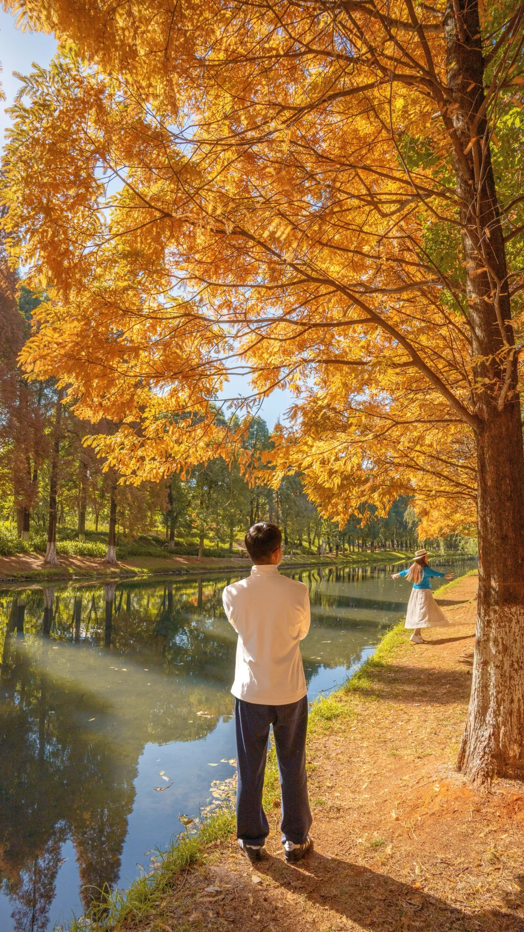 金红的水杉倒映在河水中,阳光温柔地从叶片中投射出来,给你一个温柔的午后,骑单车沿河岸穿行,微风拂面,疲惫全消。