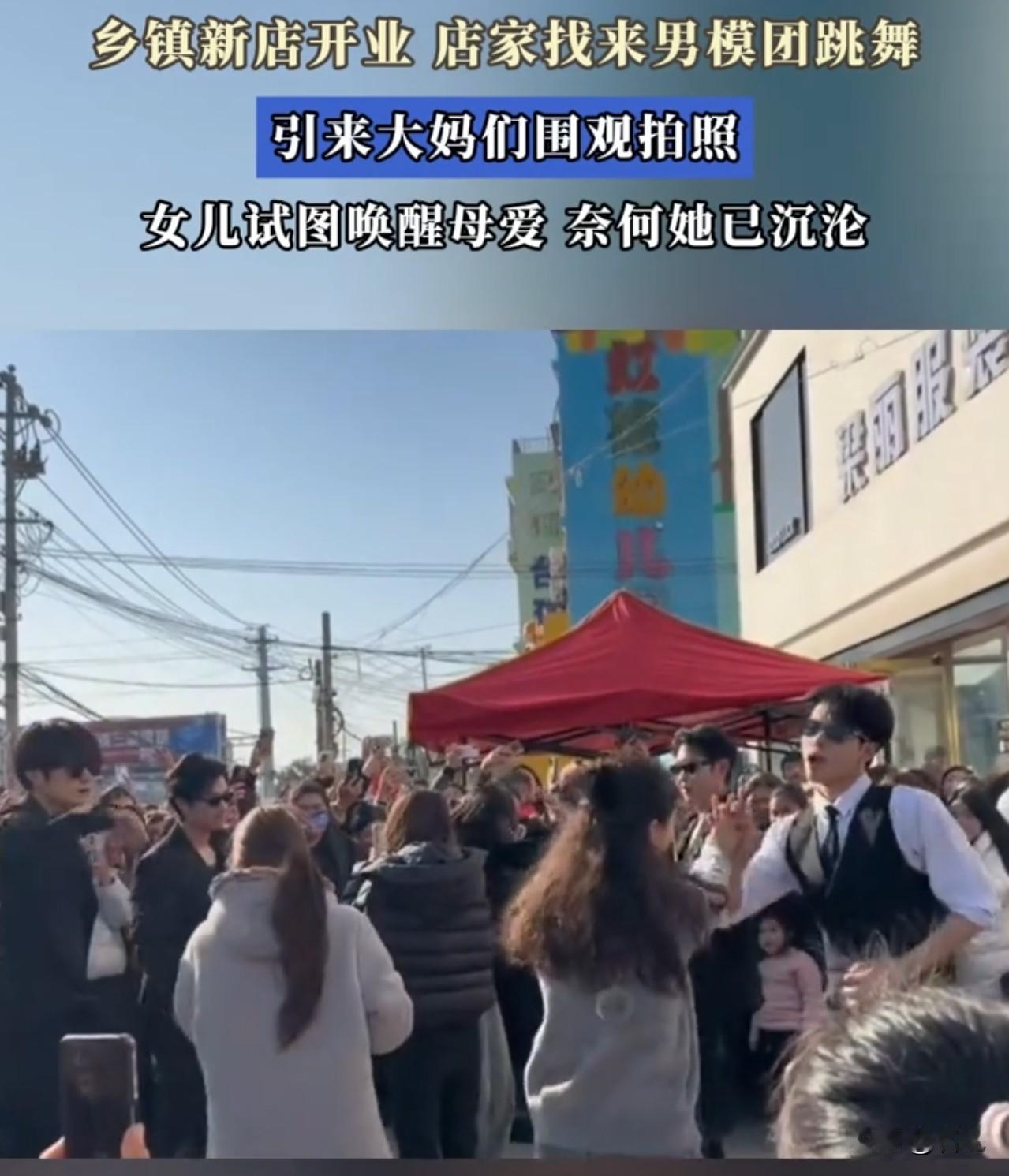 事实证明,无论多大的年纪,身份再转变,女人都有一颗少女心。 女儿试图唤醒母爱,可惜妈妈早已沉沦在男模团青春洋溢的舞姿里,一直拿着手机录视频。“怀春”的妈妈,女儿的呼喊,一个字也听不见,她的眼里只有西装革履在舞动的男模。 这宽肩窄腰,这大长腿,这帅气逼人的相貌,这撩拨的舞姿,看着就喜欢,我都迷糊了。事实证明好看的大家都喜欢。店家聪明,这波操作,热度起来了,客流量也来了。 孩子,一点眼力劲都没有,一边玩去,不要打扰美女姐姐们看帅哥!