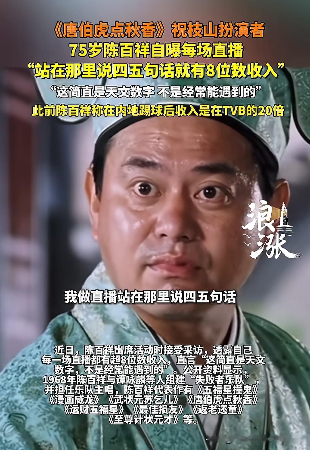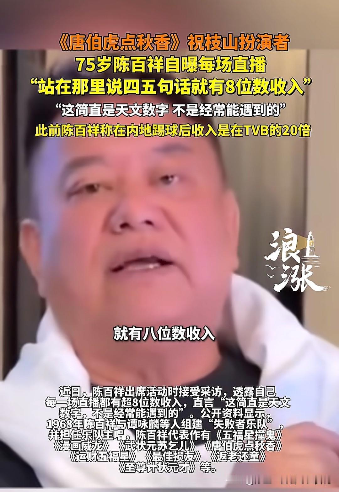 75岁的陈百祥一句话道出了很多明星艺人为什么要直播带货真相,她们不是喜欢直播,也不是真喜欢使用自己代言的产品,而是往那轻松一站,财源滚滚来,来钱的速度比做任何事都要快。 就拿陈百祥来说吧,他称自己站在那里说四五句话就有8位数收入,什么概念?如果说的是港币,至少890万人民币,一场直播按7小时去算,每秒约赚353元! 当然,很多人会认为不太现实,应该是一场带货总额。要知道,陈百祥的直播收入主要来自品牌合作、商品销售分成及团队运营收益,一场直播带来的收入自然就会高很多了。这也是为什么很多人反对明星艺人直播带货的原因。原本属于更多的人的财富,最终流向了他们的腰包,普通人直播带货赚钱难就难在这里了。