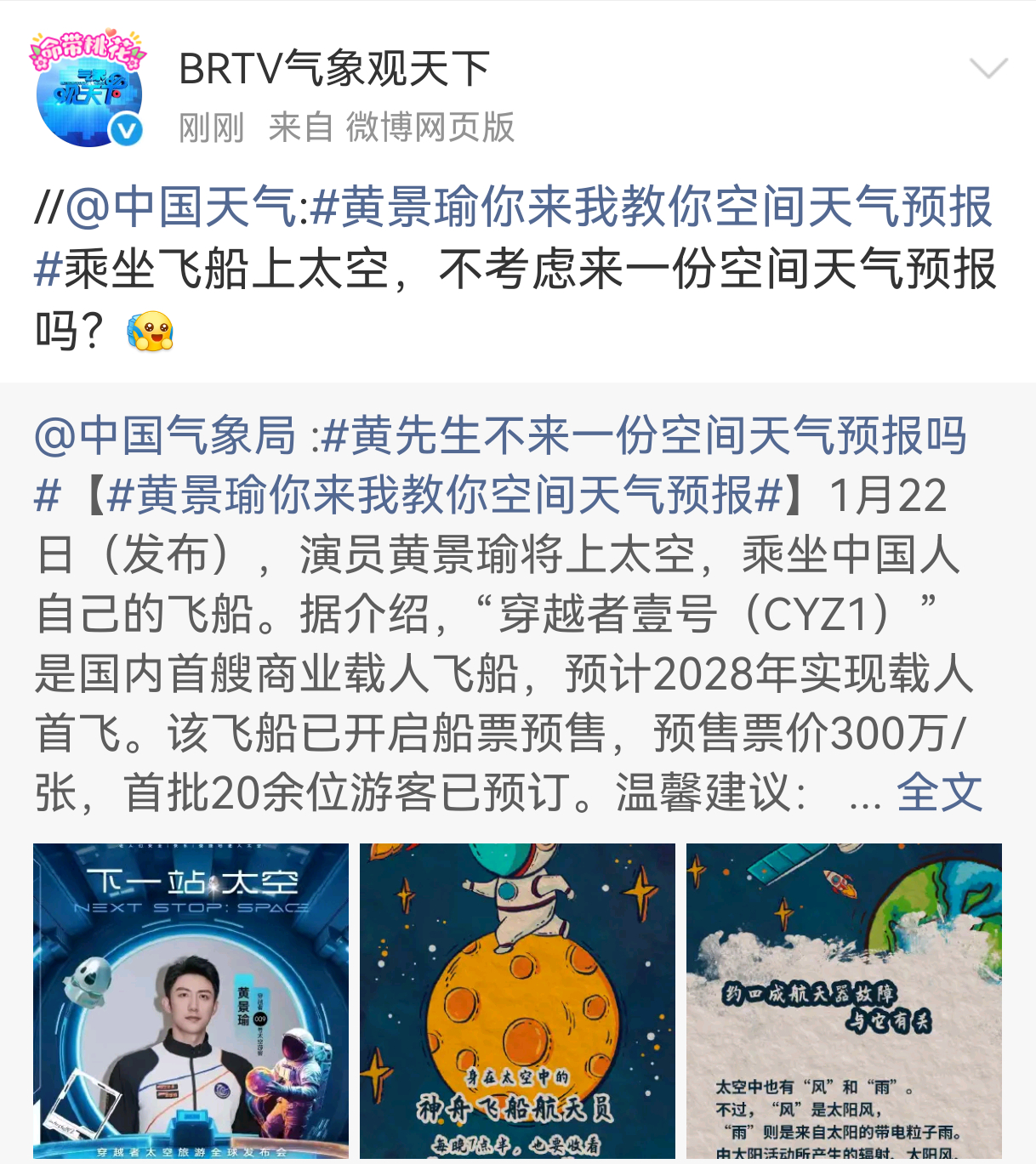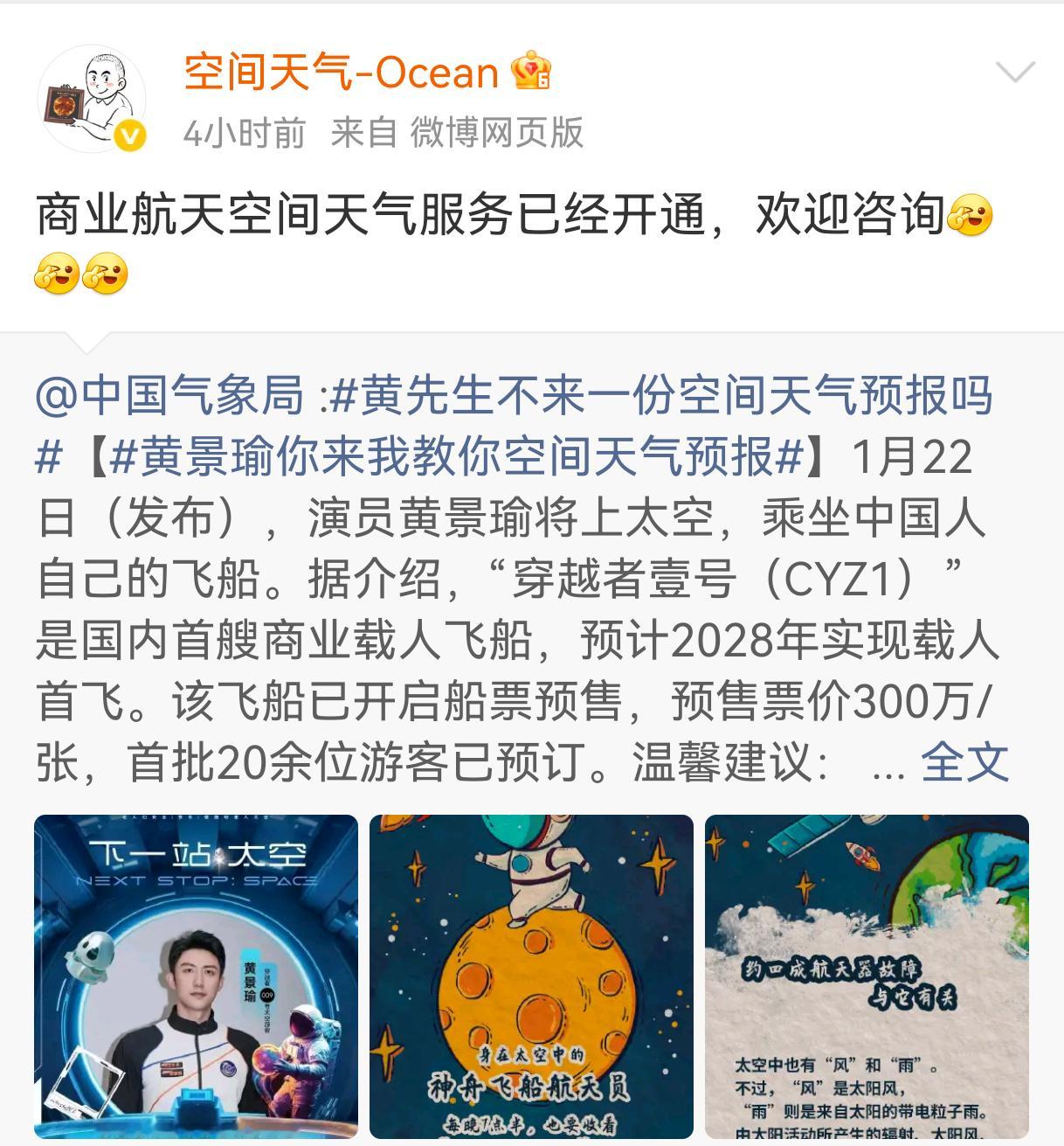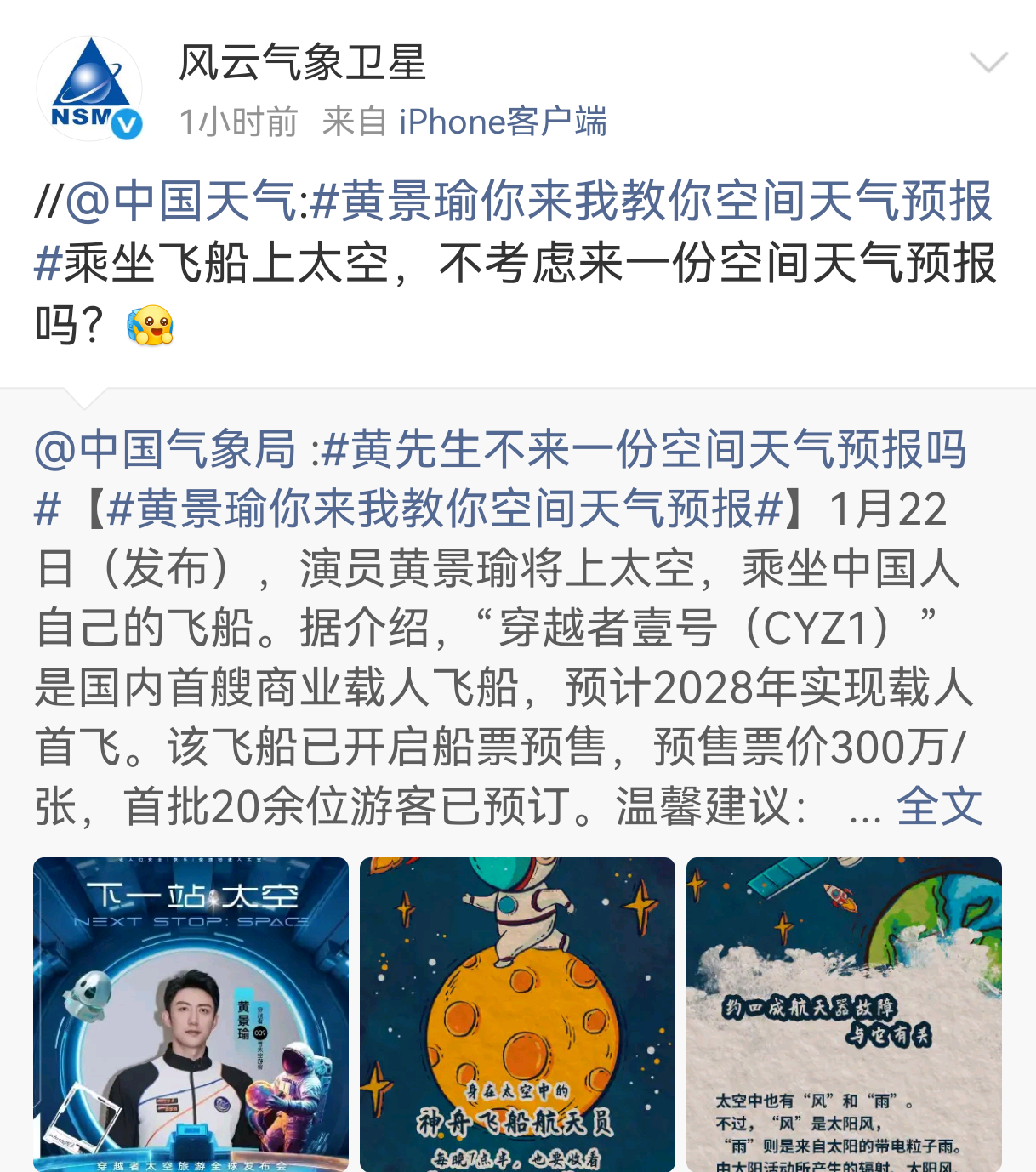 黄景瑜官宣成为国产商业飞船首批太空游客009号之后,不仅让我们国产的商业航天板块市场信心大振,更有中国气象局携各地气象和相关科普蓝V一起发来贺电,一起推广太空科普常识,这就是明星用自己的号召力引导正向社会责任的正确姿势!