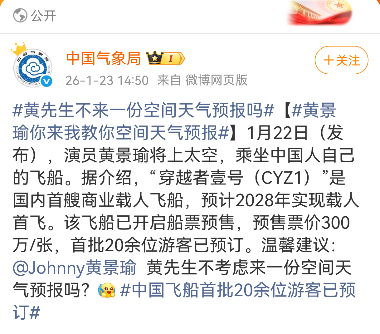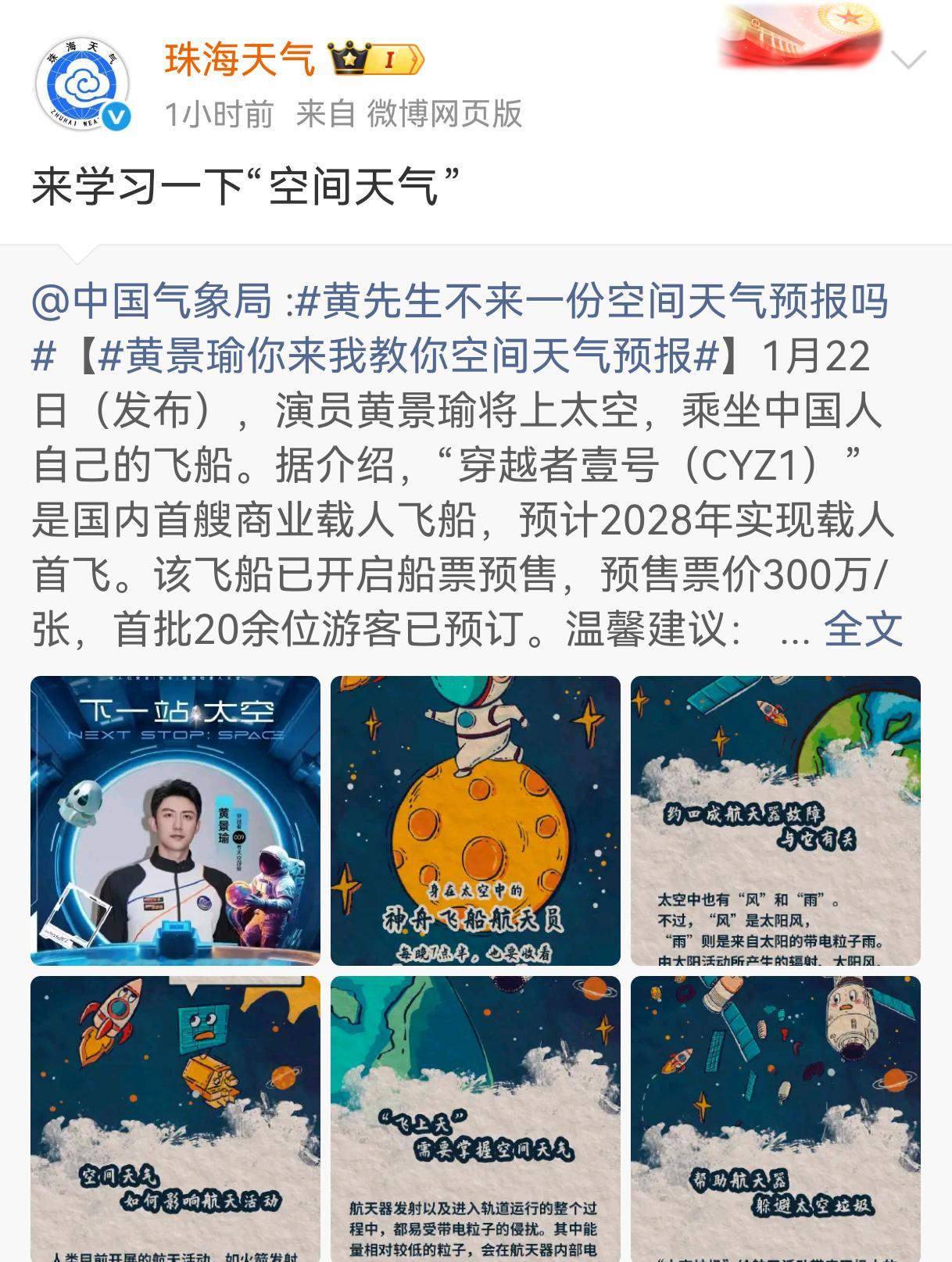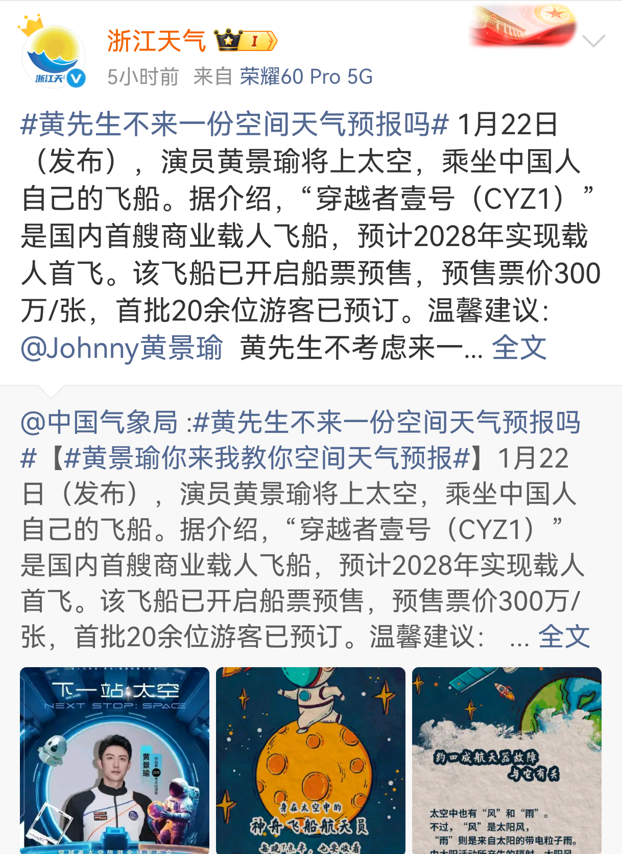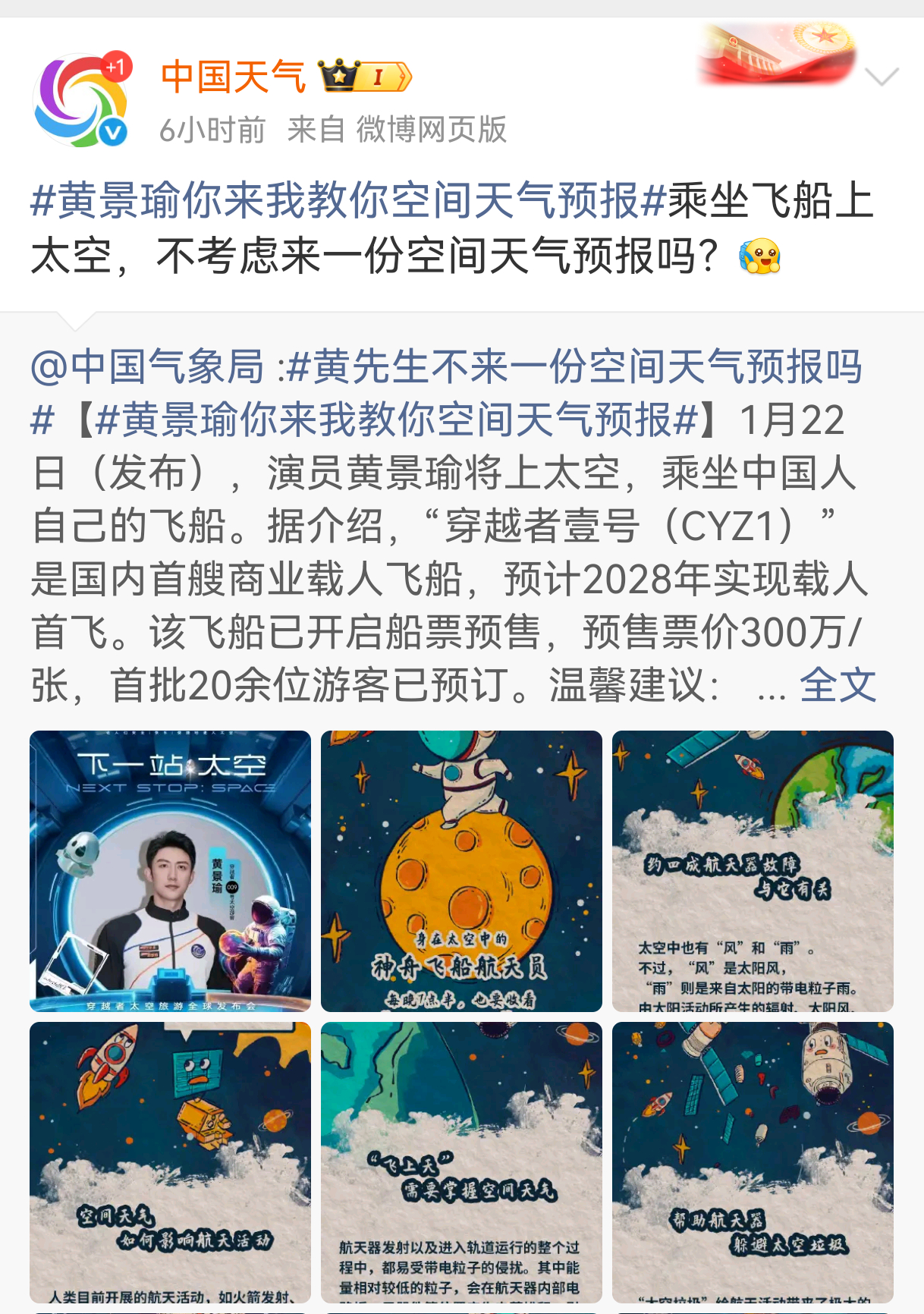 黄景瑜官宣成为国产商业飞船首批太空游客009号之后,不仅让我们国产的商业航天板块市场信心大振,更有中国气象局携各地气象和相关科普蓝V一起发来贺电,一起推广太空科普常识,这就是明星用自己的号召力引导正向社会责任的正确姿势!