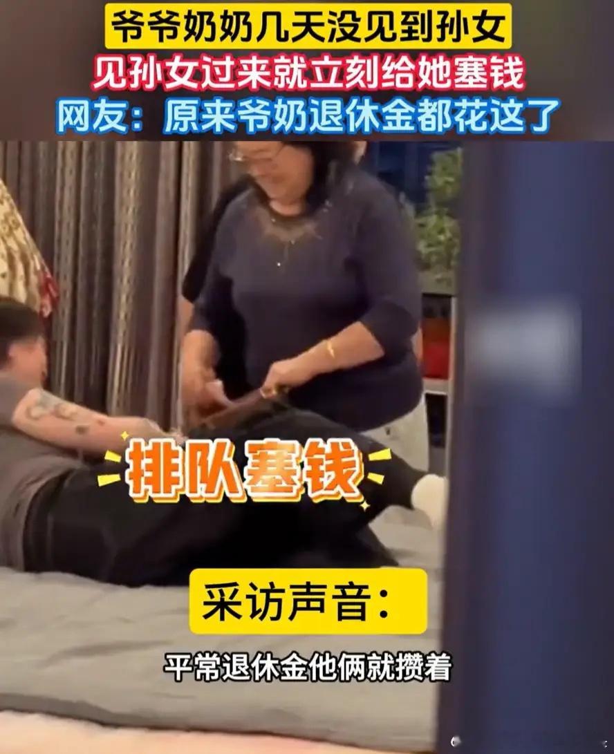 这就是有钱人宠孩子的方式啊!一位孙女去周末去爷爷奶奶家,吃完晚饭后躺在床上玩手机,突然爷爷奶奶走到床边,一人掏出一沓现金给孙女当零花钱,而给钱的人甚至比收钱的人还高兴。网友:隔辈亲,就是不一样视频中,孙女趴在床上,抬着脚悠闲地玩着手机,这时爷爷先走过来,从兜里面掏出几千块钱,然后递给了孙女,孙女收下后也是相当高兴,可这还没完,很快奶奶也拎着包过来,随后又掏出几千块钱给孙女,老两口都高兴的不得了拍视频的家人说,这不是头一回了。老两口的退休金平时舍不得花,就攒着,隔段时间就给孙子孙女塞个三五千,成了习惯这画面,很多人一看就懂。留言里有人说,这就是隔辈亲,没道理可讲。也有人说,老人攒了一辈子的钱,舍不得吃穿,最后全给了孩子其实想想,这事挺值得琢磨的。老人给钱,图的不是孩子买什么,而是那种“我还能为你做点什么”的心安他们那代人,习惯用最实在的方式表达爱,怕你吃不好,怕你钱不够,怕你在外面受委屈。给钱,成了他们能想到的最直接、也最踏实的方法有人说,老人这样给钱,会不会把孩子宠坏?其实视频里能看出来,孙女也不是那种理所当然伸手要钱的样子。她笑得挺腼腆,看得出是知道感恩的。或许最好的回应不是拒绝,也不是光说谢谢。而是真的把这笔钱用在实处,或者时不时告诉老人,你过得挺好,偶尔也给他们塞点心意,哪怕不多。爱需要流动,才知道它一直在爷爷奶奶几天没见孙女 见面就塞钱