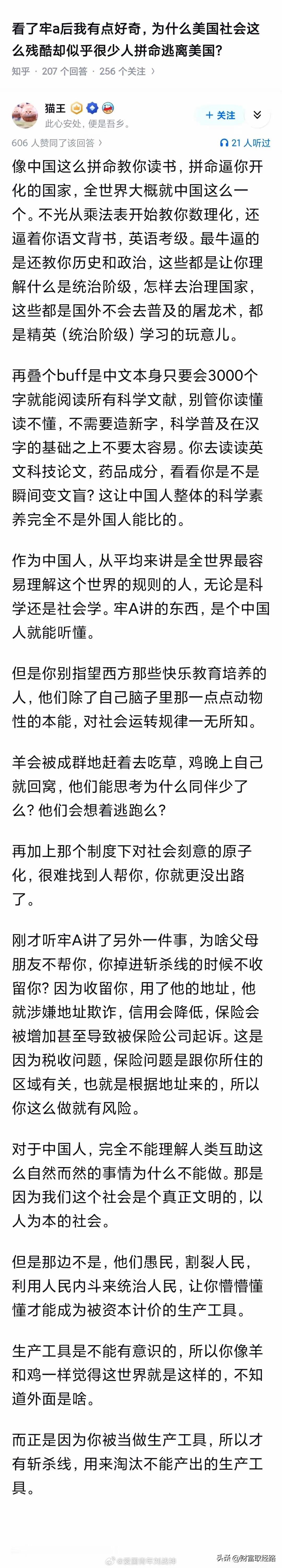 “为什么美国社会这么残酷却似乎很少人拼命逃离美国?”