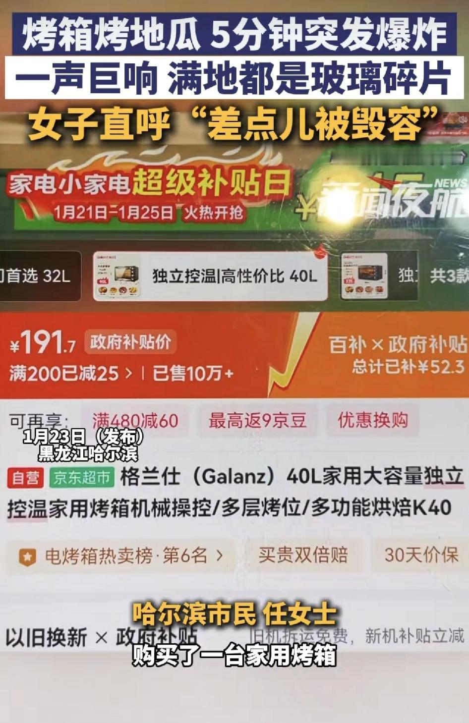 黑龙江哈尔滨一女子在京东平台购买了一台格兰仕家用烤箱,隔几天用烤箱来烤地瓜时,在。机器运行到5分钟的时候突然发生爆炸,满地都是玻璃碎渣。女子说,如果当时在现场的话,都差点不会用了,而三家的客服表示,他们并不是说没有爆炸的可能,比如生产10万个,不可能一个都不会爆。既然造成了意外,也就会给人家退款和给一点补偿给消费者,如果伤害了人,也会有其中的办法来应对。