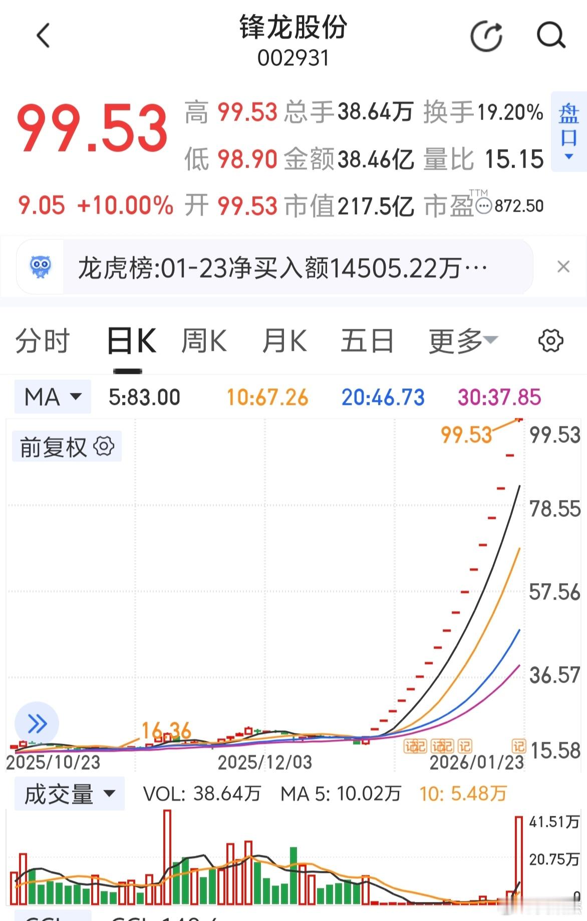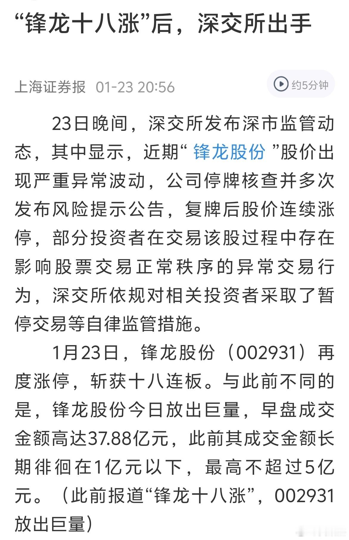 锋龙都十八个涨停板了,到底是什么资金在追高?竟然有38亿成交量,估计要被埋了,因为深交所出手了。