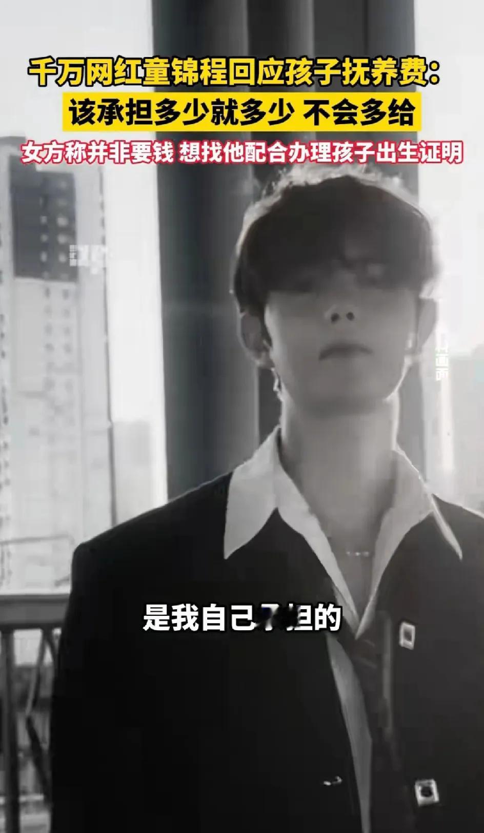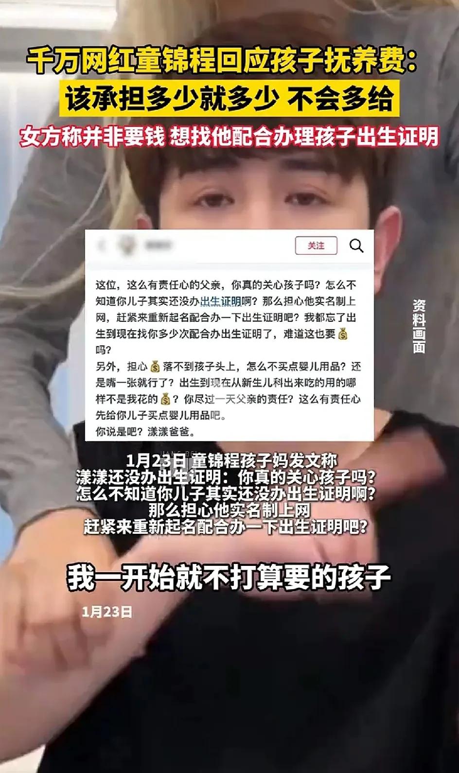 千万网红童锦程终于第一次当网友面回应孩子问题。他说:孩子本来就不是我想生的。该给多少抚养费,多1分我都不会给。不可能妥协我的性格就是这样刚了第一步要继续刚下去。孩子有点可爱,还有点可怜。言下之意,孩子的妈妈把孩子放在网络上,还实名制,让孩子以后长大了也不好做人。孩子以后还要学习还要工作,还要面对他自己的人生。他质问对方能不能给孩子用个小名,或者说以后改个大名。 随后漾漾的妈妈赶紧回应说,你既然那么有责任,你能不能配合我给孩子办出生证明啊?那么有责任能不能给孩子买点婴儿用品?有网友指出,办出生证明根本就不需要男方配合。女方这样无非是想跟男方走的更近一些。多一些关联。女方曝出私生子事件之后,差不多过了20多天,童锦程第一次回应。 这件事我站童锦程这一边。原本就不是和自己爱的女人生的孩子,原本就不想要。谁愿意被绑架,谁愿意被束缚,谁愿意被动接受别人硬塞过来的责任。 又不是女朋友,本来就是逢场作戏,第一次见面就发生关系的那种。这样的女人他又不愿意娶,也不愿意当他孩子的母亲。 那女的呢?以为有了孩子就有了筹码。这种捞女现象不应该被网友们去追捧。 试问童景城如果是个负债累累的穷鬼,这个女的会上赶着给他生孩子吗?