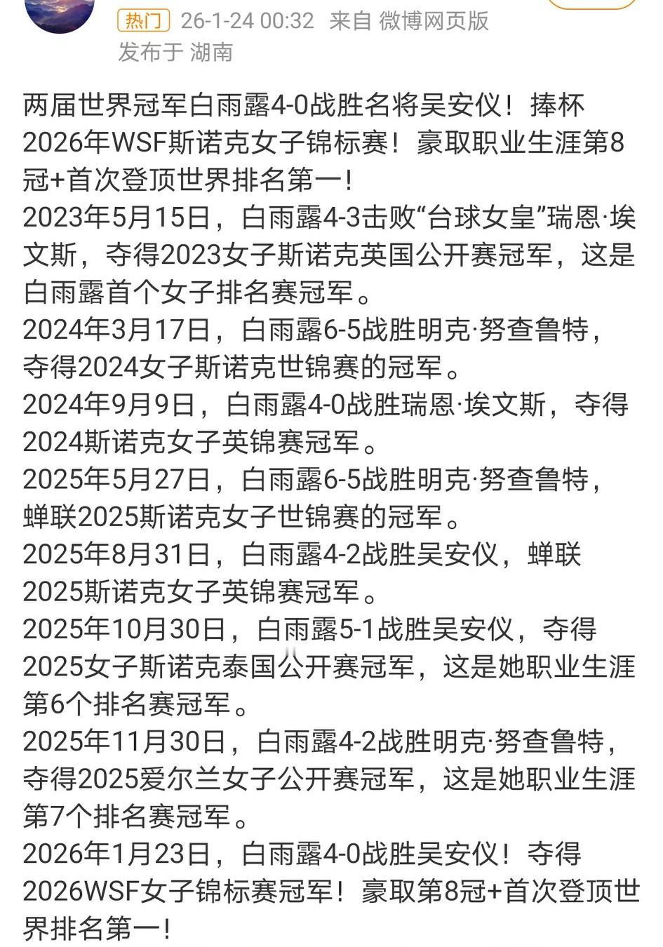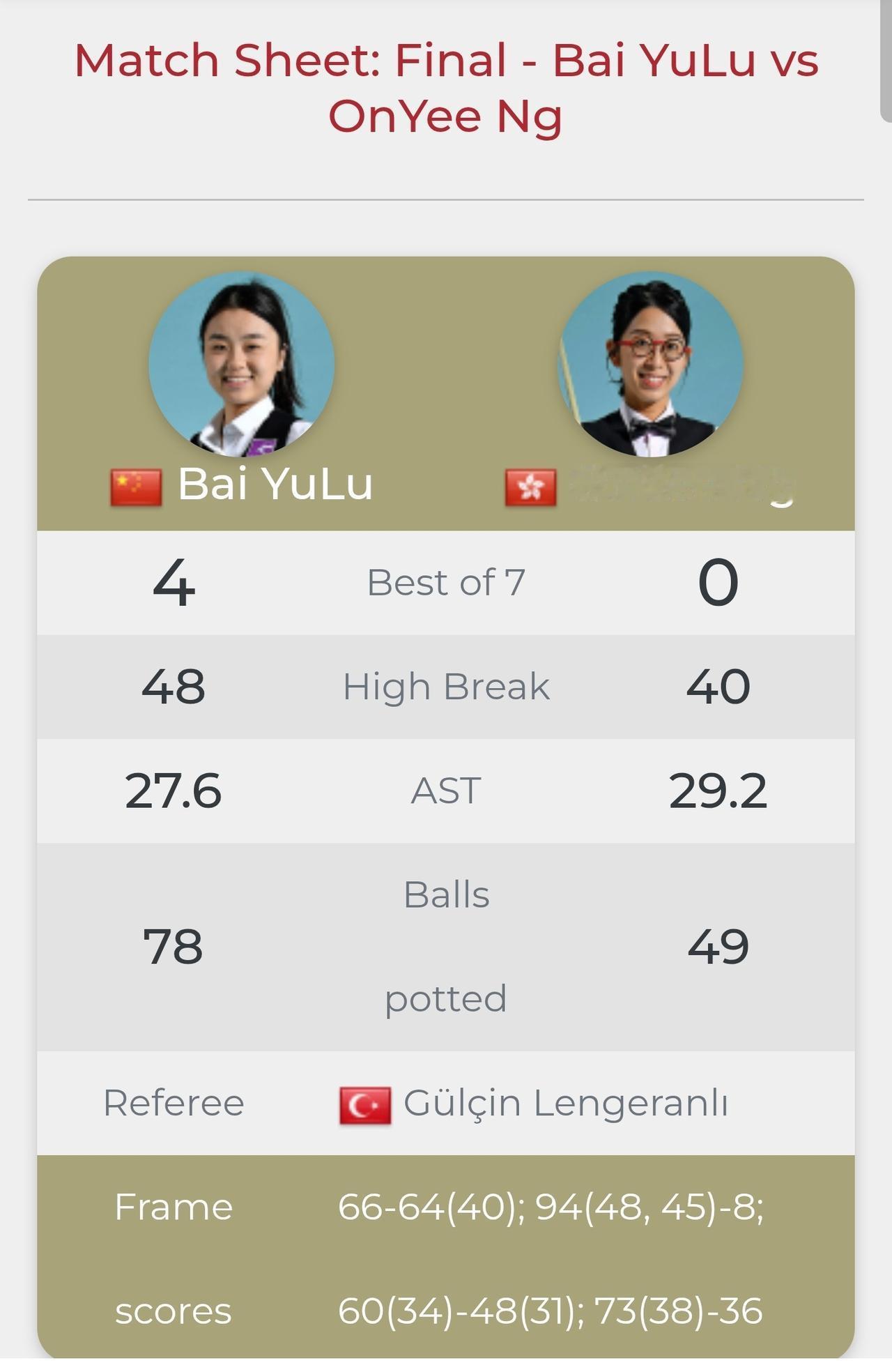 女子奥沙利文!随着白雨露夺得WSF女子锦标赛冠军,她也一跃成为女子斯诺克世界第一。 职业生涯已经取得8个重要巡回赛冠军,本届赛事她一局未失,两杆破百。越来越像奥沙利文了。