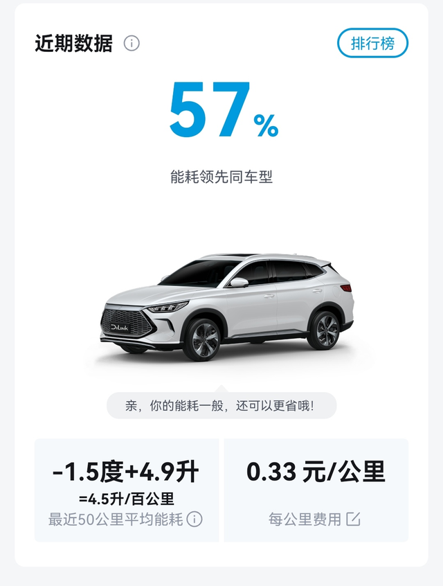 我的宋PLUSDM-i总里程已达15291公里 最近50公里平均能耗为(-1.5度 + 4.9升)/百公里,折合4.5升/百公里,每公里费用0.33元,能耗领先同车型57% 。累计平均能耗是(3.8度 + 3.9升)/百公里,相当于5.0升/百公里,领先同车型36%。和节能榜的其他车主相比,还有一定的节能空间