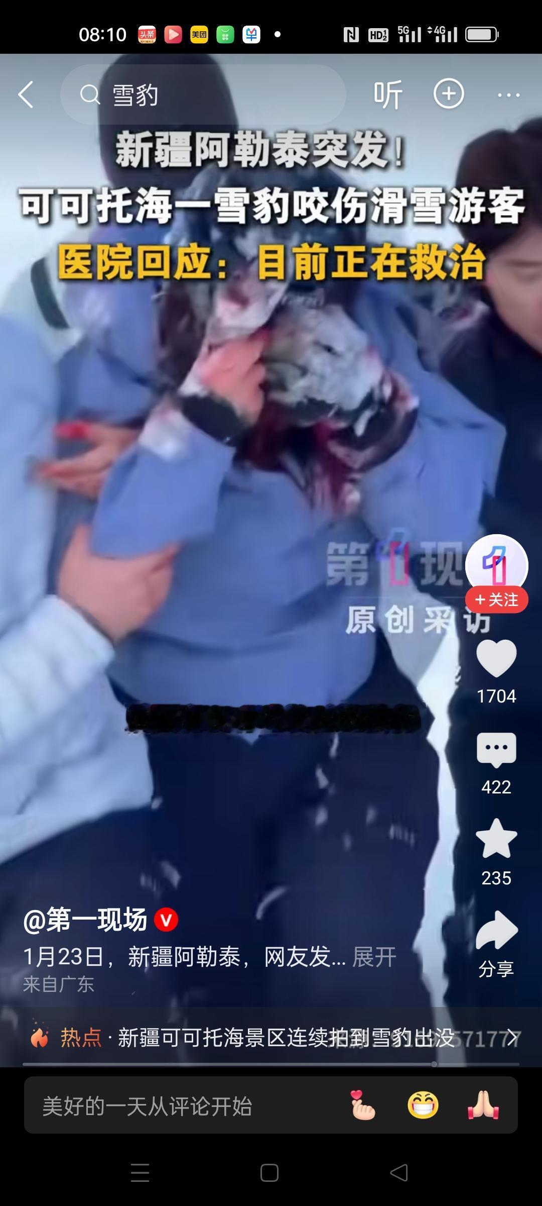 雪豹:心上人,我在可可托海等你 ,他们说你是不是倒在雪里? 是不是因为那里有美丽的那拉提,还是那里的雪花才能酿出你要的“甜蜜”? 游客在滑雪过程中遭雪豹袭击咬伤,太吓人了。滑雪都有这么大风险。幸好没被锁喉,人还只是外伤。 就是雪豹故意伤人,能不能抓起来判个三五年的,关动物园里也行啊