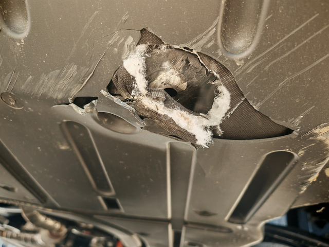 底盘塑料护板维修 没看到门口的一个坑,过去的时候听见咚的一声,下来看就这样了,大佬们帮忙看看,这种去4儿子店修要多少钱啊,需不需要报保险