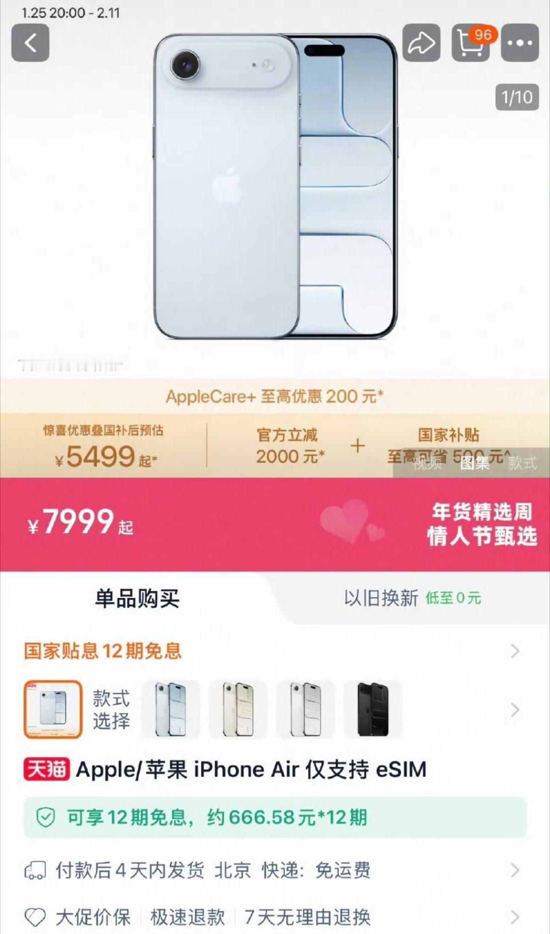 iPhone Air国行将至5499起!官方补贴2000,国补500等于直降2500这个价格让其它家的Air很尴尬不过对于iPhone Air来说 这才是合理的价格