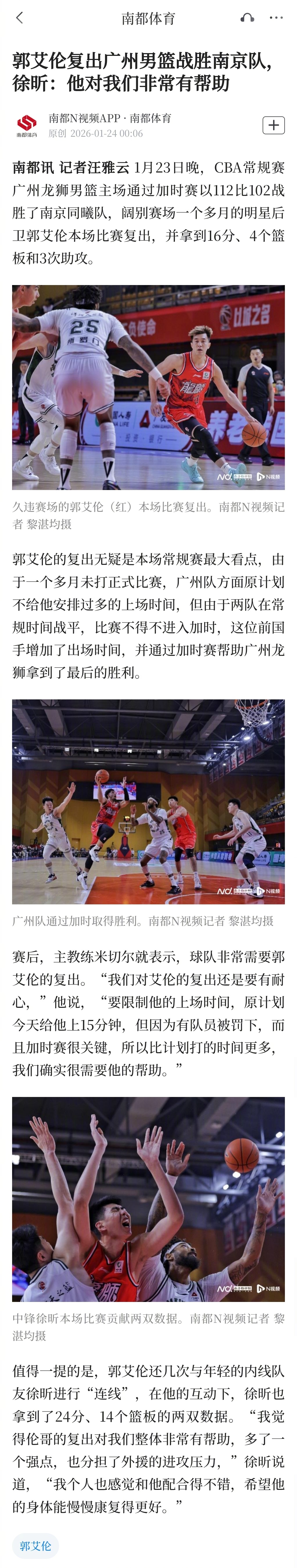 【#郭艾伦复出广州男篮战胜南京队#,徐昕:他对我们非常有帮助】1月23日晚,CBA常规赛广州龙狮男篮主场通过加时赛以112比102战胜了南京同曦队,阔别赛场一个多月的明星后卫郭艾伦本场比赛复出,并拿到16分、4个篮板和3次助攻。郭艾伦的复出无疑是本场常规赛最大看点,由于一个多月未打正式比赛,广州队方面原计划不给他安排过多的上场时间,但由于两队在常规时间战平,比赛不得不进入加时,这位前国手增加了出场时间,并通过加时赛帮助广州龙狮拿到了最后的胜利。赛后,主教练米切尔就表示,球队非常需要郭艾伦的复出。“我们对艾伦的复出还是要有耐心,”他说,“要限制他的上场时间,原计划今天给他上15分钟,但因为有队员被罚下,而且加时赛很关键,所以比计划打的时间更多,我们确实很需要他的帮助。”值得一提的是,郭艾伦还几次与年轻的内线队友徐昕进行“连线”,在他的互动下,徐昕也拿到了24分、14个篮板的两双数据。“我觉得伦哥的复出对我们整体非常有帮助,多了一个强点,也分担了外援的进攻压力,”徐昕说道,“我个人也感觉和他配合得不错,希望他的身体能慢慢康复得更好。”
