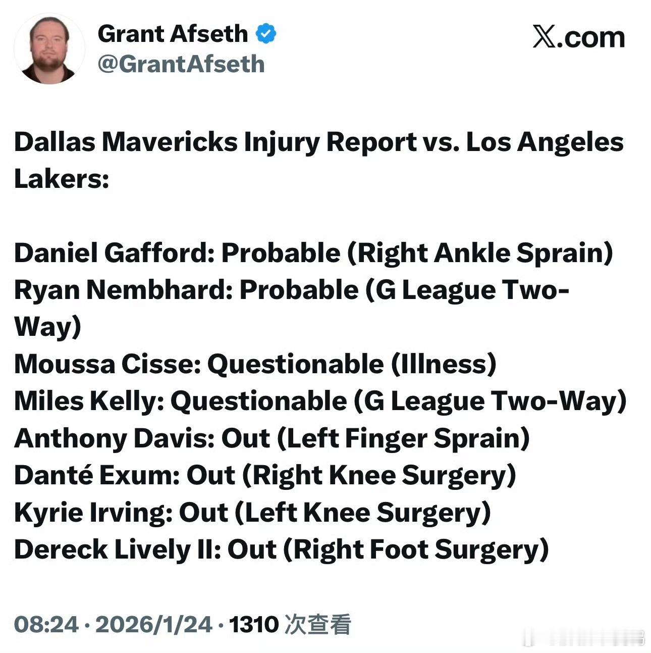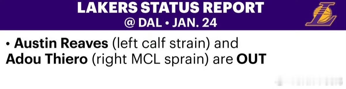 湖人独行侠明日伤病名单!湖人迎两条炸裂好消息及一条坏消息!湖人这边—里夫斯(左小腿拉伤)、蒂耶罗(右膝内侧副韧带扭伤)明日缺席!独行侠这边—戴维斯(左手指扭伤)、埃克萨姆(右膝手术)、欧文(左膝手术)、莱夫利二世(右脚手术)明日缺席!加福德(右脚踝扭伤)、小内姆哈德大概率出战!西塞(疾病)凯利(双向合同)出战成疑!第一条好消息:里夫斯蒂耶罗明日继续缺席!而根据雷迪克最新透露,他说里夫斯目前恢复状态良好,有望在8连客之旅中迎来复出!太好了!里夫斯在本赛季一直超负荷打球,在此前对阵火箭那场比赛他左下腿拉伤彻底倒下!目前已经连续缺席14场比赛,在这14场比赛里,湖人取得7胜7负,而昨天湖人又在第二节断电,进攻端太依靠双核的发挥了,其他角色球员提供的帮助微乎其微,里夫斯快回来吧!第二条好消息:独行侠这边伤员极其惨重!莱弗利赛季报销,浓眉又因手指伤势,已经缺席了7场比赛了!无望再面对旧主了,上一场打完后,浓眉饱含热泪!其次欧文又在ACL恢复中,目前还没有准确复出情况!埃克萨姆也高挂免战金牌!缺了四位核心对于湖人来说肯定是好事了!坏消息:独行侠官方宣布因脚踝扭伤缺席了四场比赛的加福德,确认在明天复出!湖人真不愧华佗队,昨天的小卡就是如此!!洛杉矶湖人詹姆斯湖人国度独行侠