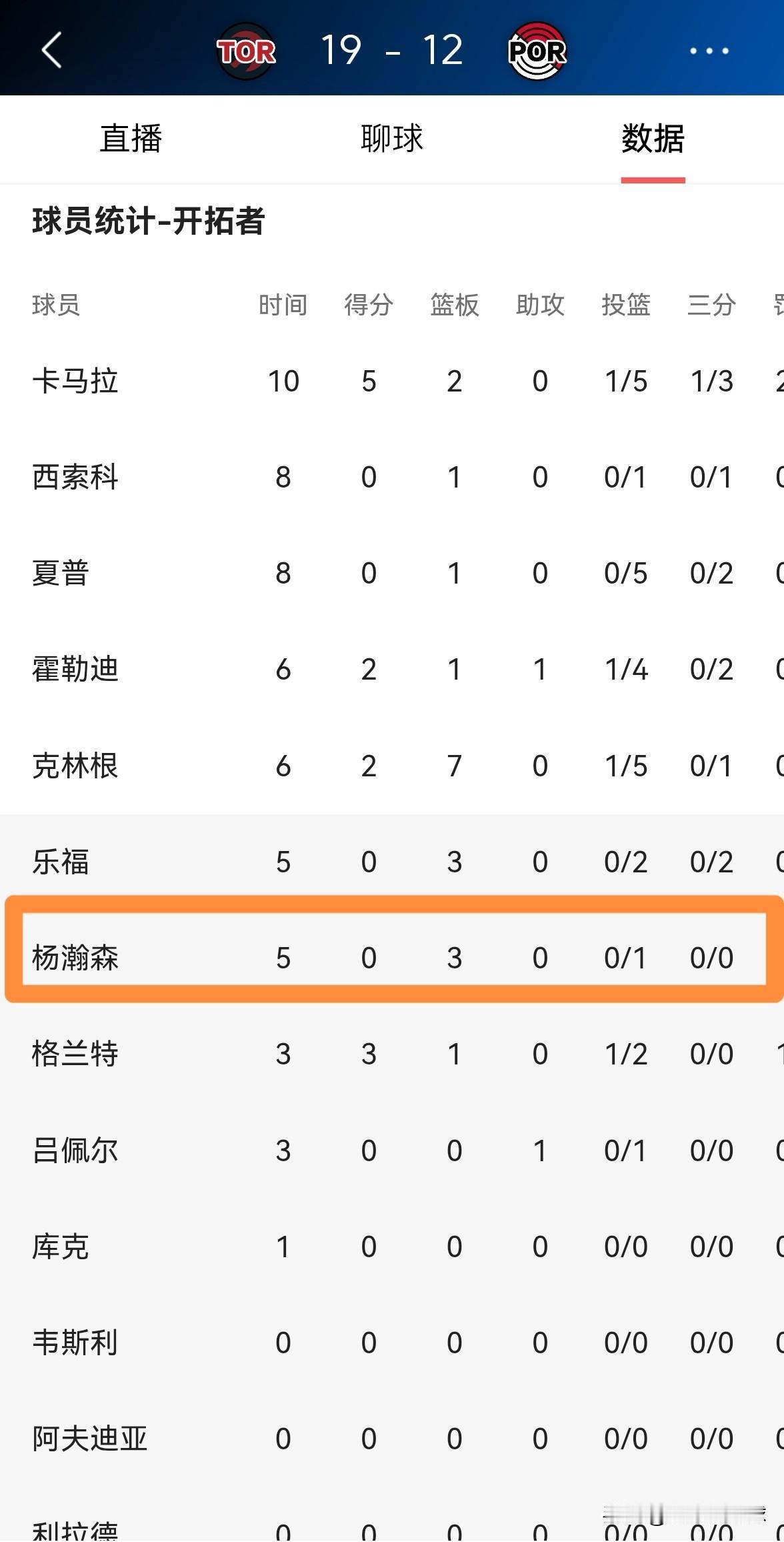 开拓者新星杨瀚森真是让人眼前一亮!在今天开拓者主场迎战猛龙的比赛中,目前双方的第一节比赛已经结束,虽然开拓者以12:19落后于对手,但是杨瀚森却拼抢到了3个篮板,展现出了非常强的拼搏精神。 在第一节比赛中,杨瀚森仅仅替补出战5分钟,投篮1中0没有得分,不过抢到了3个篮板。 不出意外的话,本场比赛杨瀚森的篮板数将会创造职业生涯的新高,让我们拭目以待吧。