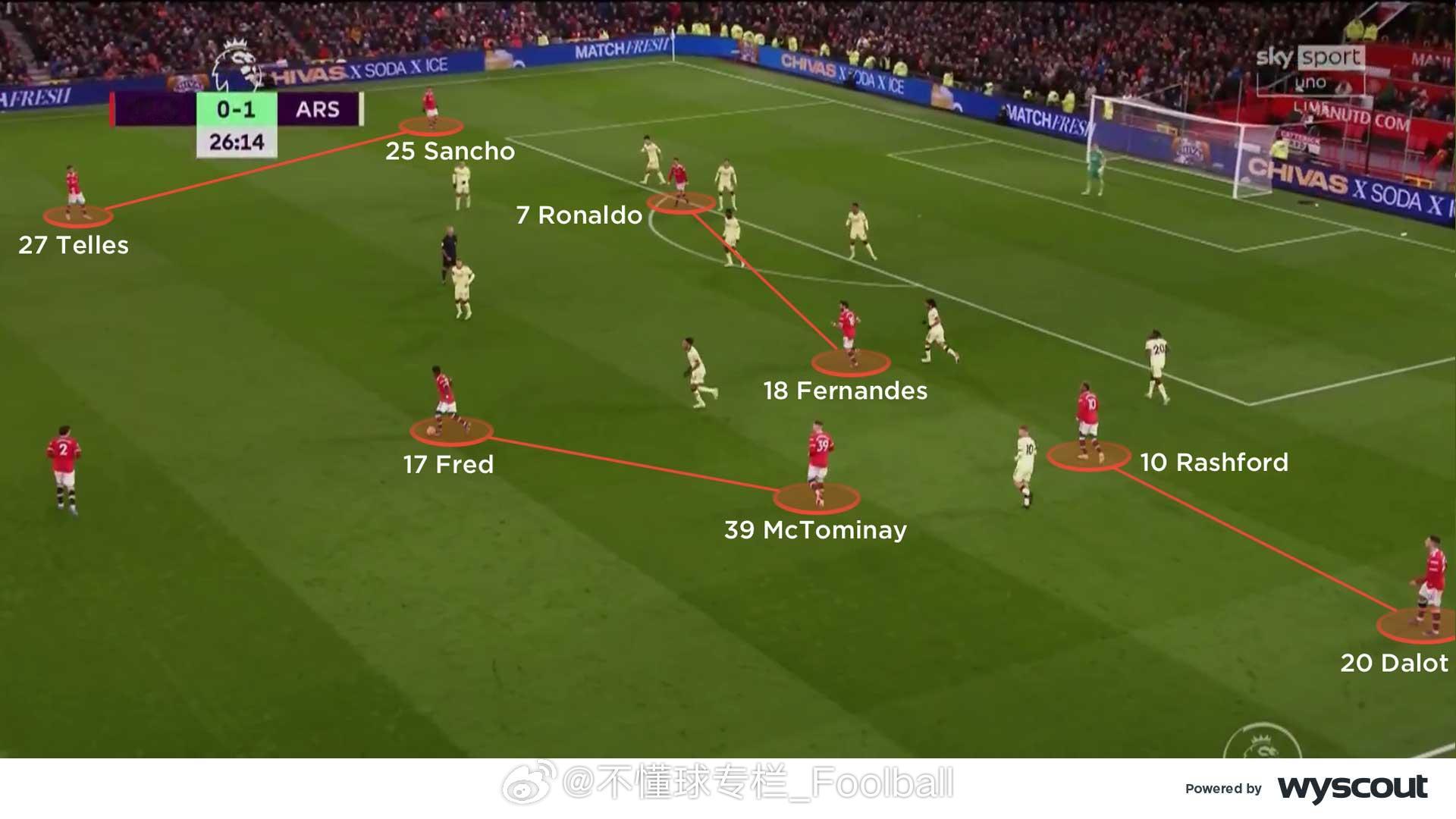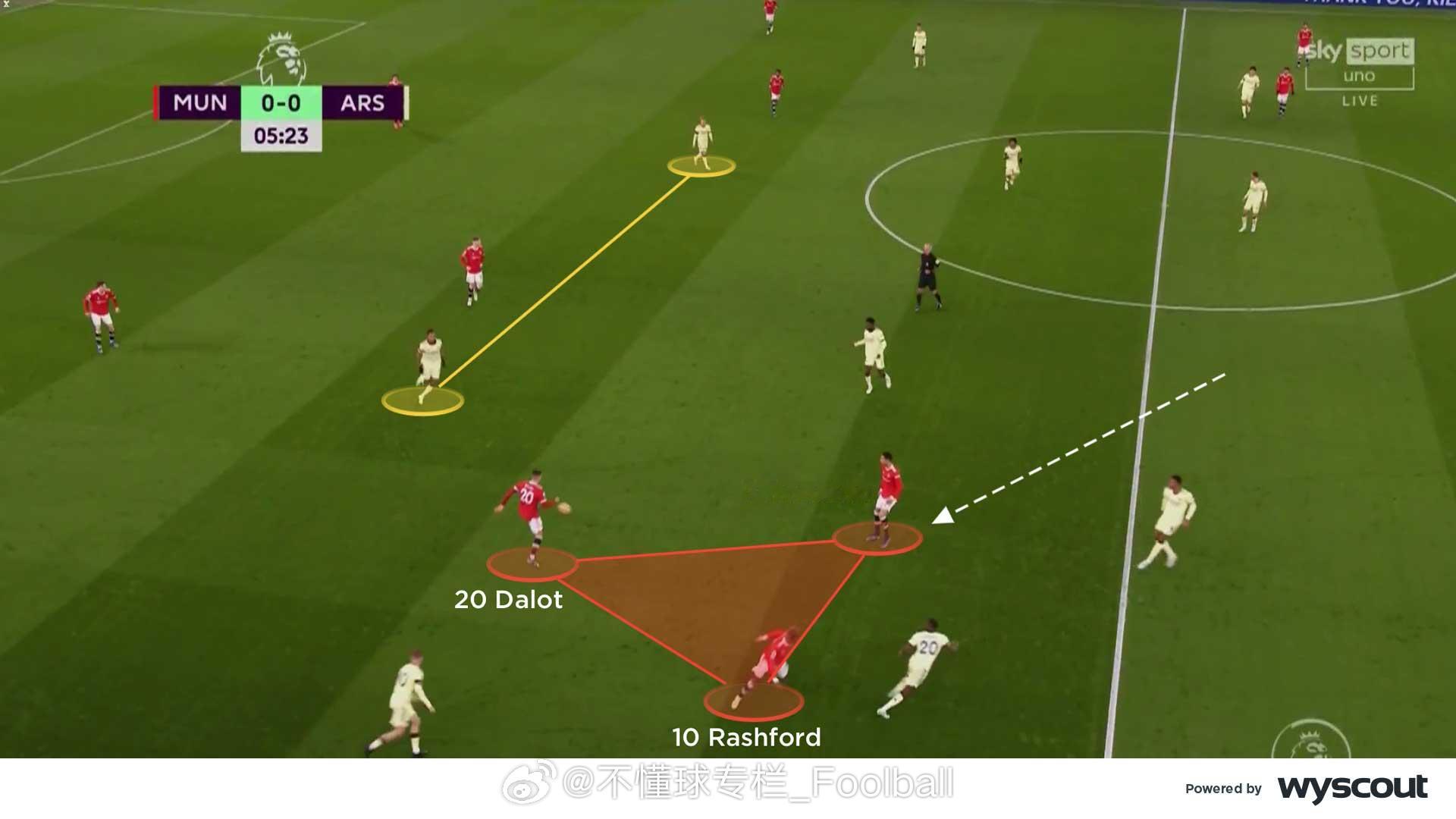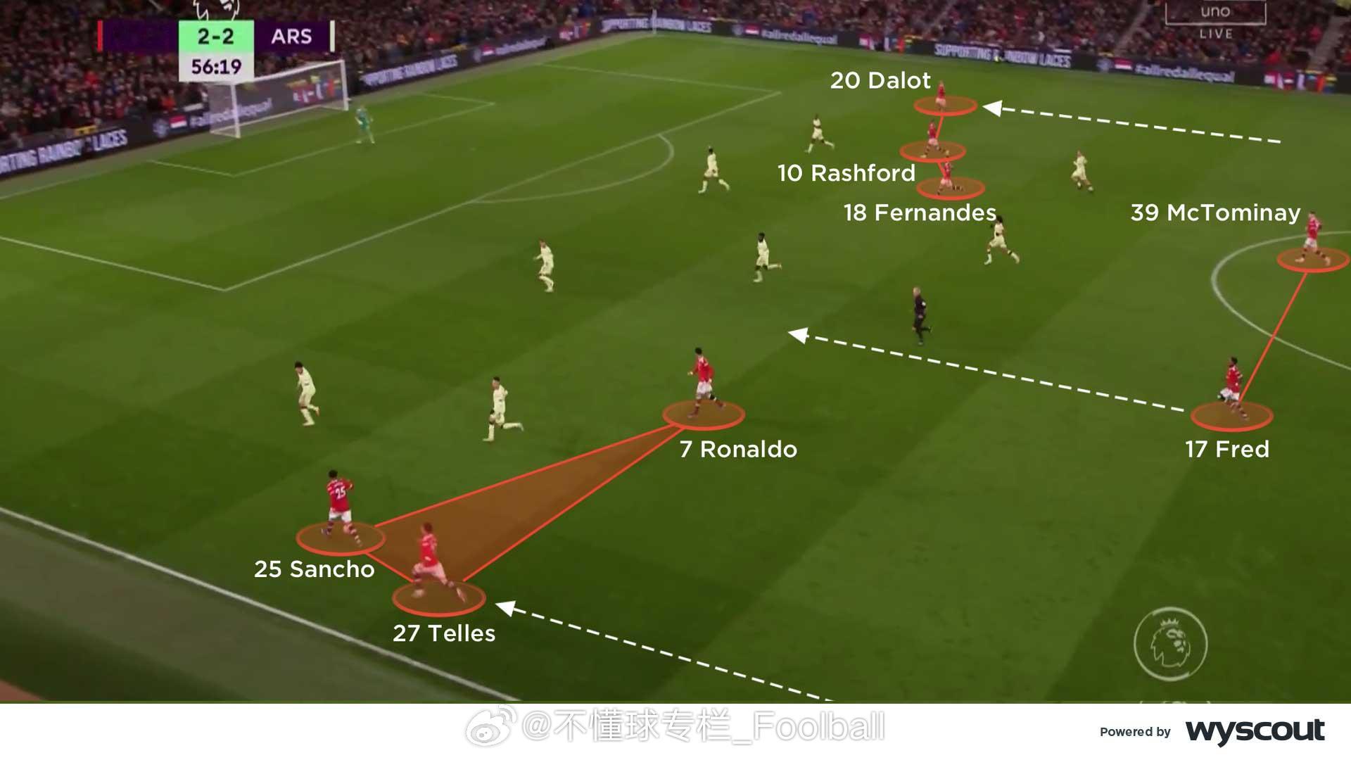 (旧文重发)CV对2021年12月3日曼联3比2阿森纳的战术分析:【曼联控球时】- 三角站位:卡里克的4-2-3-1阵型中,C罗和布鲁诺会轮番回撤,靠近边路,与边锋与边后卫形成三角配合,在阿森纳4-4-2无球阵型中双前锋的身后组织(图一)。C罗来到右侧时,会寻求给拉什福德身后球的机会,或者寻找麦克托米奈和弗雷德的双中场来完成转移。在左侧时,他与桑乔的配合追求更快速的推进。- 进攻组合:推进到进攻三区时,曼联的的边后卫和边锋会形成协同。在左路,桑乔更多会内切,让左后卫特莱斯套边插上。在右路,拉什福德会位置更加拉边,伺机送出低平传中和倒三角。C罗和布鲁诺轮流回撤到两线之间(图二),弗雷德和麦克托米奈则在中场中路回收球权。曼联的这种战术持续给阿森纳施加压力,迫使后者长时间处于防守状态。有时,布鲁诺会移至右路,桑乔就会来到中路与C罗寻求配合,保持中路的人数优势。 - 长传转移:马奎尔会从左侧给右路的拉什福德和达洛斜长传转移(图三),寻找塔瓦雷斯身后的空当。弗雷德和麦克托米奈依然镇守中路,争抢第二落点,破坏对方的反击。同时,弗雷德也随时准备加入布鲁诺和C罗的进攻组合。曼联的首开纪录以及弗雷德赢得的点球都是这一战术的成果。- 支援边路:上半场就极具威胁的边路攻势延续到了下半场,阿森纳中场之间的空当变得更大,曼联得以利用这样的空当,尤其是肋部的空间。两个边后卫持续前压,支援身前的边锋。C罗和布鲁诺也会来到边路球员的内侧协助接应(图四),给到边路球员足够的支持,也给弗雷德的插上提供了空间。【阿森纳控球时】- 箱式中场:阿森纳的4-2-3-1有时会组成箱式中场(图五)。史密斯·罗从左路内收,厄德高向右路移动,埃尔内尼和托马斯则在身后提供支持,四人组合在对曼联在三人中场形成了人数优势,并为塔瓦雷斯从左路前插创造了空间。马丁内利保持在右路边路,奥巴梅扬则伺机在曼联中后卫之间活动。史密斯·罗和厄德高在麦克托米奈和弗雷德附近的空当区域接球,并尝试将球传给马丁内利和塔瓦雷斯。- 三人中场:阿森纳有时也会变成4-3-3的进攻阵型,埃尔内尼会回撤到前插的塔瓦雷斯身后(图六),史密斯·罗依旧内收,厄德高依旧留在右路肋部,马丁内利拉边,确保阿森纳拥有足够的宽度来应对潜在的反击。但这牺牲了中场人数优势,从而削弱了他们的进攻潜力。- 曼联高压:这或许预示着朗尼克上任后曼联可能的战术走向,——联经常采用高位逼抢(图七),通过弧线逼抢将球引导到边路,迫使阿森纳的双后腰回撤。曼联的进攻球员紧盯阿森纳的双后腰,同时一名边锋也内收,迫使阿森纳球员在后场把球传向边路。曼联的双后腰会横向移动,使阿森纳难以将球传给厄德高或史密斯·罗,从而无法将球顺利推进,只能尝试直接长传,提高了曼联成功防守的机会。- 右路潜力:富安健洋在马丁内利靠边时会选择从内线插上(图八)。史密斯·罗继续从左路内收,形成箱式中场,并为奥巴梅扬提供支援。阿森纳的右路进攻威胁更大,因此曼联做出回应,边锋和布鲁诺都回撤到更深的位置,形成低位防守。阿森纳的箱式中场组合不断尝试通过破线传球找到前锋,但成功率不高,因此右路的配合成为他们最有效的进攻途径。曼联 英超联赛