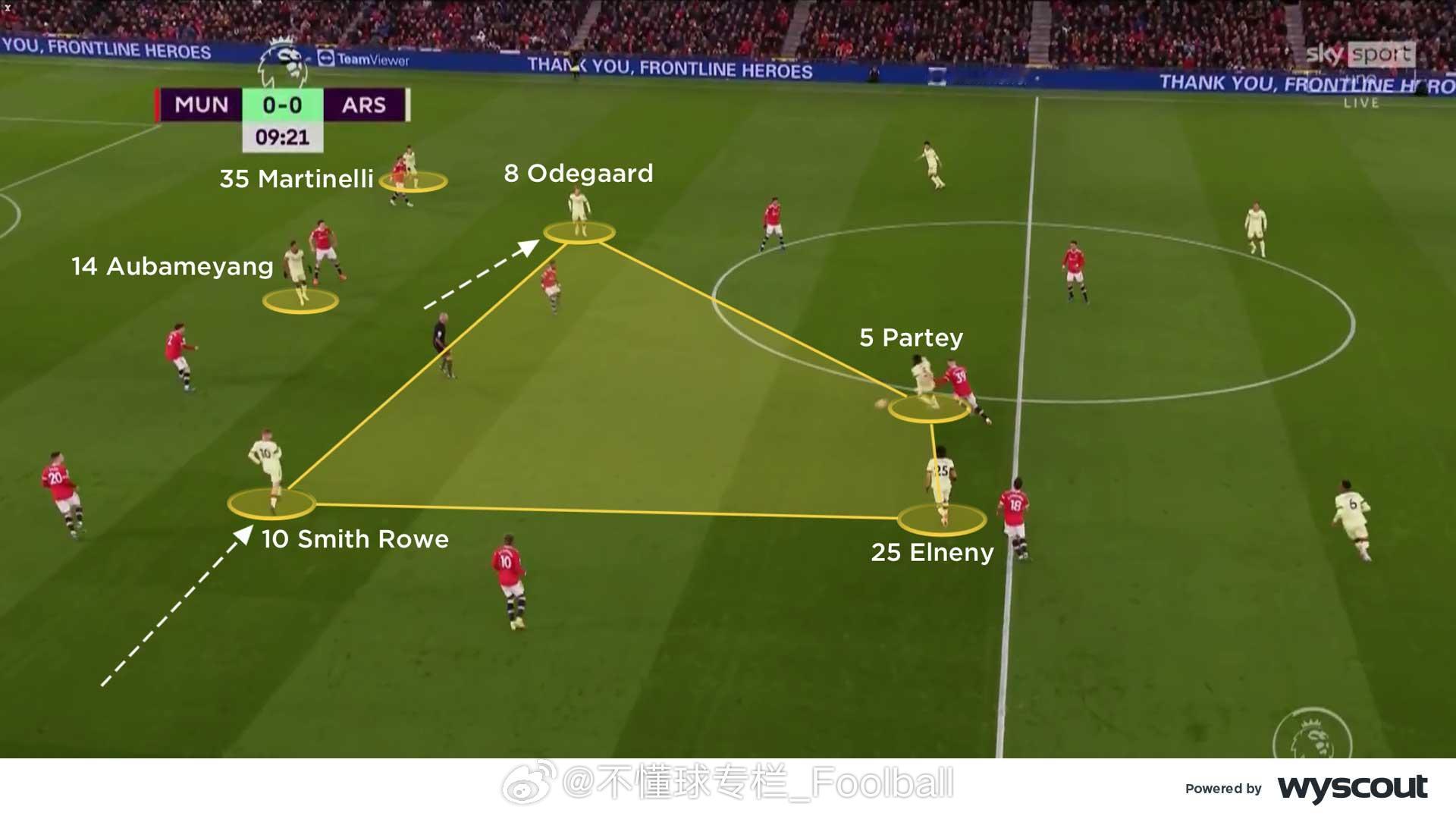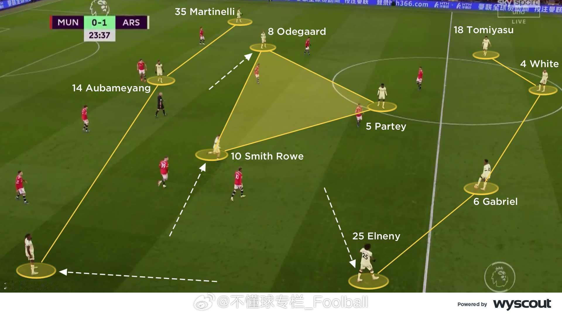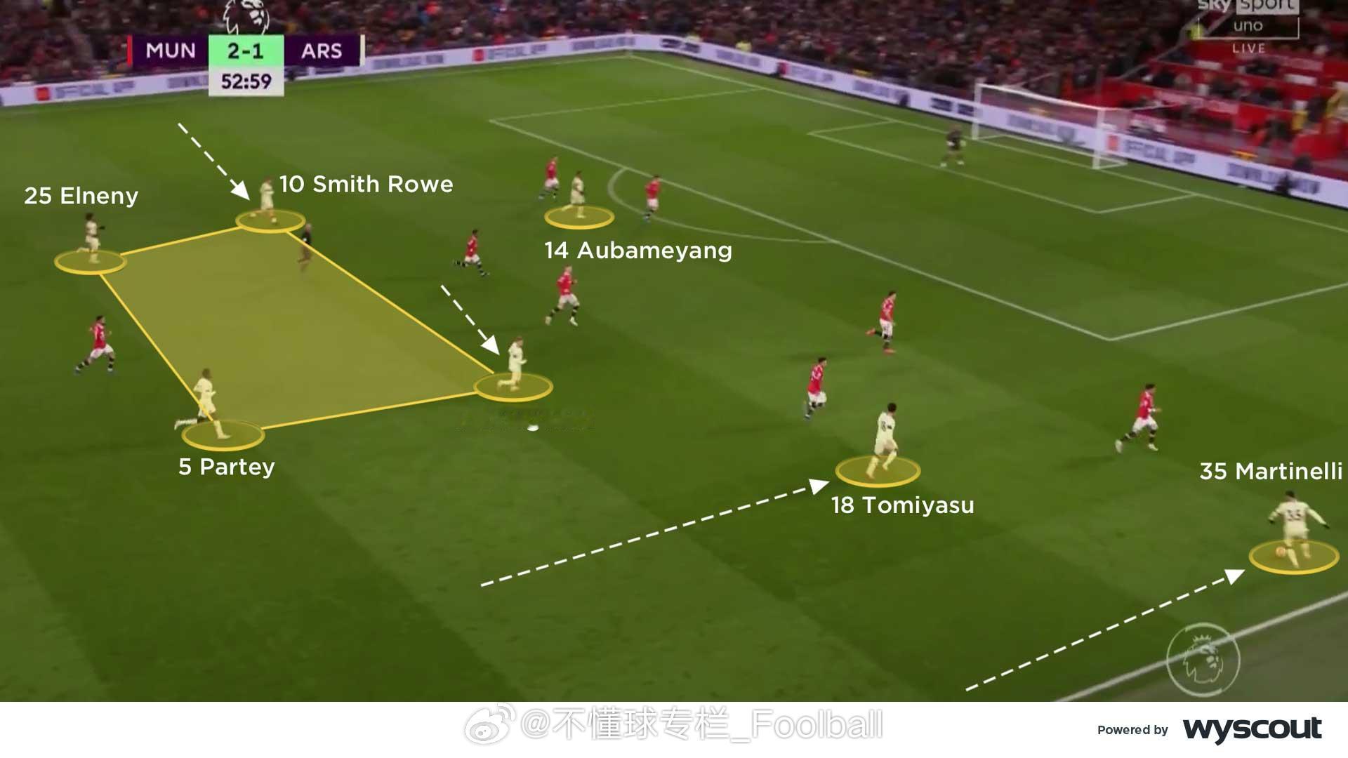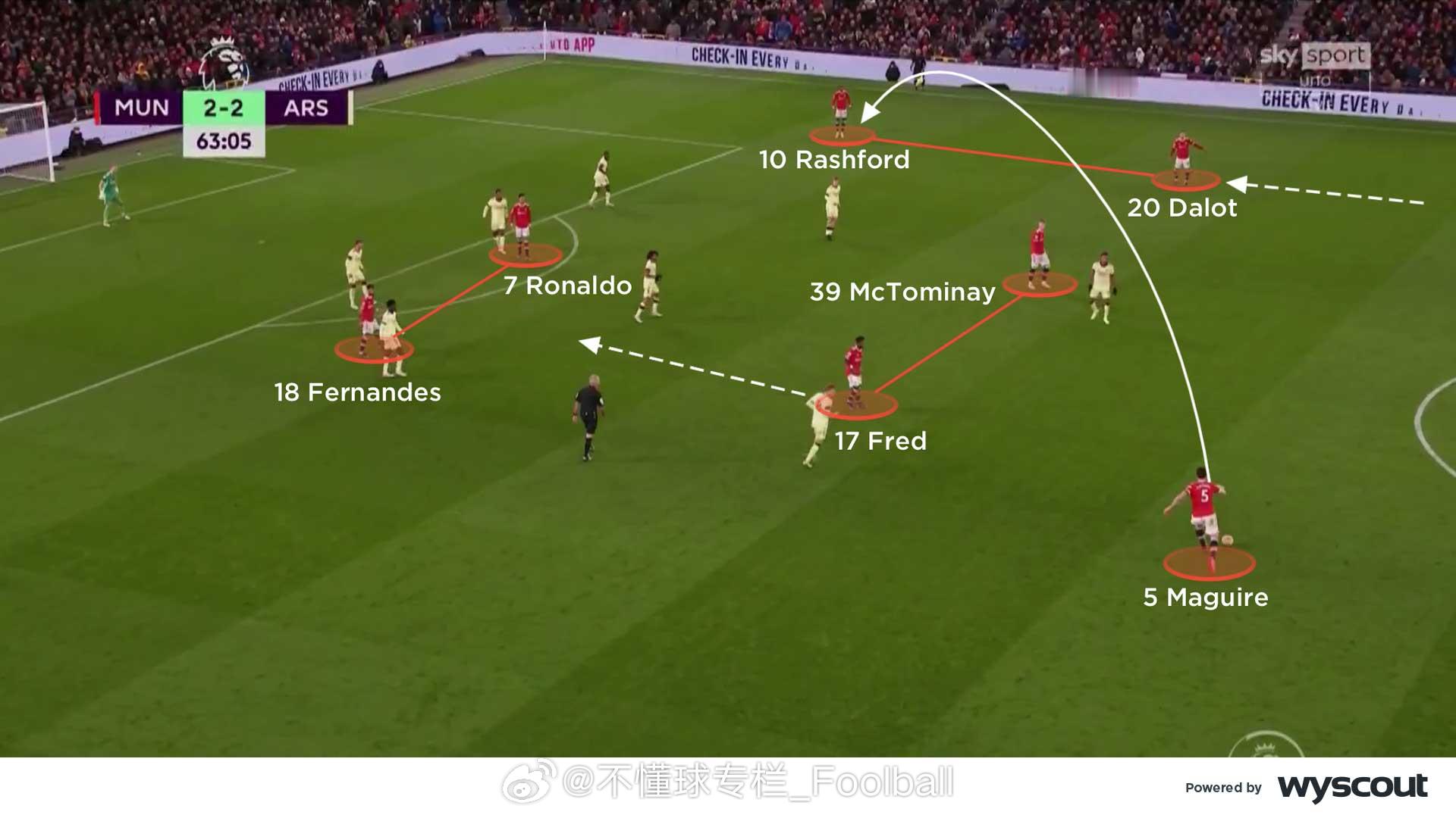 (旧文重发)CV对2021年12月3日曼联3比2阿森纳的战术分析:【曼联控球时】- 三角站位:卡里克的4-2-3-1阵型中,C罗和布鲁诺会轮番回撤,靠近边路,与边锋与边后卫形成三角配合,在阿森纳4-4-2无球阵型中双前锋的身后组织(图一)。C罗来到右侧时,会寻求给拉什福德身后球的机会,或者寻找麦克托米奈和弗雷德的双中场来完成转移。在左侧时,他与桑乔的配合追求更快速的推进。- 进攻组合:推进到进攻三区时,曼联的的边后卫和边锋会形成协同。在左路,桑乔更多会内切,让左后卫特莱斯套边插上。在右路,拉什福德会位置更加拉边,伺机送出低平传中和倒三角。C罗和布鲁诺轮流回撤到两线之间(图二),弗雷德和麦克托米奈则在中场中路回收球权。曼联的这种战术持续给阿森纳施加压力,迫使后者长时间处于防守状态。有时,布鲁诺会移至右路,桑乔就会来到中路与C罗寻求配合,保持中路的人数优势。 - 长传转移:马奎尔会从左侧给右路的拉什福德和达洛斜长传转移(图三),寻找塔瓦雷斯身后的空当。弗雷德和麦克托米奈依然镇守中路,争抢第二落点,破坏对方的反击。同时,弗雷德也随时准备加入布鲁诺和C罗的进攻组合。曼联的首开纪录以及弗雷德赢得的点球都是这一战术的成果。- 支援边路:上半场就极具威胁的边路攻势延续到了下半场,阿森纳中场之间的空当变得更大,曼联得以利用这样的空当,尤其是肋部的空间。两个边后卫持续前压,支援身前的边锋。C罗和布鲁诺也会来到边路球员的内侧协助接应(图四),给到边路球员足够的支持,也给弗雷德的插上提供了空间。【阿森纳控球时】- 箱式中场:阿森纳的4-2-3-1有时会组成箱式中场(图五)。史密斯·罗从左路内收,厄德高向右路移动,埃尔内尼和托马斯则在身后提供支持,四人组合在对曼联在三人中场形成了人数优势,并为塔瓦雷斯从左路前插创造了空间。马丁内利保持在右路边路,奥巴梅扬则伺机在曼联中后卫之间活动。史密斯·罗和厄德高在麦克托米奈和弗雷德附近的空当区域接球,并尝试将球传给马丁内利和塔瓦雷斯。- 三人中场:阿森纳有时也会变成4-3-3的进攻阵型,埃尔内尼会回撤到前插的塔瓦雷斯身后(图六),史密斯·罗依旧内收,厄德高依旧留在右路肋部,马丁内利拉边,确保阿森纳拥有足够的宽度来应对潜在的反击。但这牺牲了中场人数优势,从而削弱了他们的进攻潜力。- 曼联高压:这或许预示着朗尼克上任后曼联可能的战术走向,——联经常采用高位逼抢(图七),通过弧线逼抢将球引导到边路,迫使阿森纳的双后腰回撤。曼联的进攻球员紧盯阿森纳的双后腰,同时一名边锋也内收,迫使阿森纳球员在后场把球传向边路。曼联的双后腰会横向移动,使阿森纳难以将球传给厄德高或史密斯·罗,从而无法将球顺利推进,只能尝试直接长传,提高了曼联成功防守的机会。- 右路潜力:富安健洋在马丁内利靠边时会选择从内线插上(图八)。史密斯·罗继续从左路内收,形成箱式中场,并为奥巴梅扬提供支援。阿森纳的右路进攻威胁更大,因此曼联做出回应,边锋和布鲁诺都回撤到更深的位置,形成低位防守。阿森纳的箱式中场组合不断尝试通过破线传球找到前锋,但成功率不高,因此右路的配合成为他们最有效的进攻途径。曼联 英超联赛