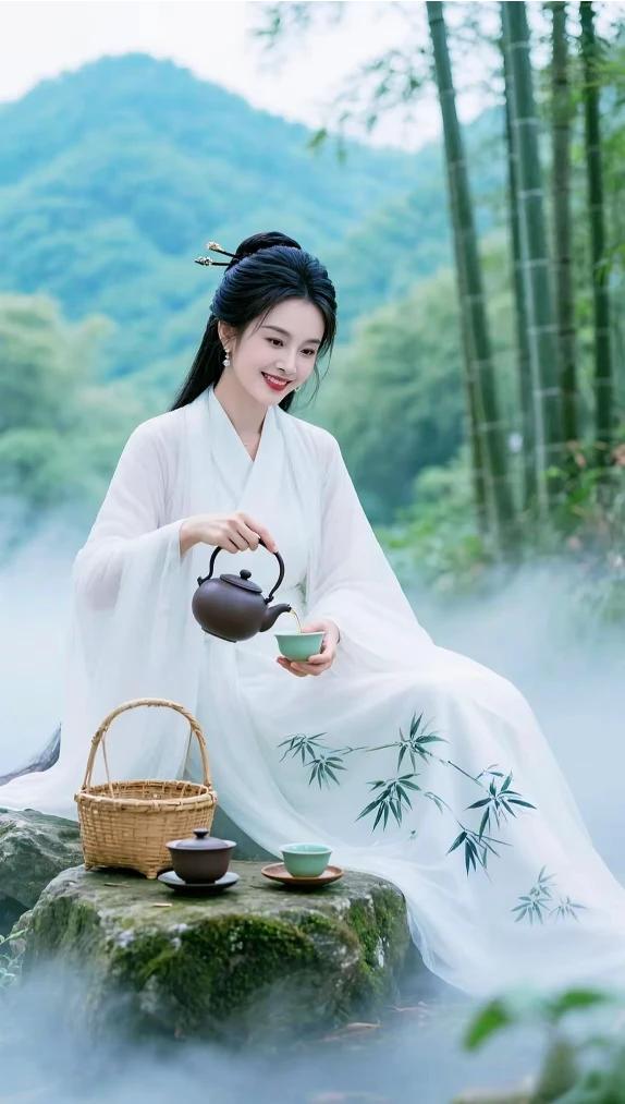 旗袍雅致衬娇容, 白底淡花韵味深。 眉似春山含远黛, 眸若秋水映繁星。