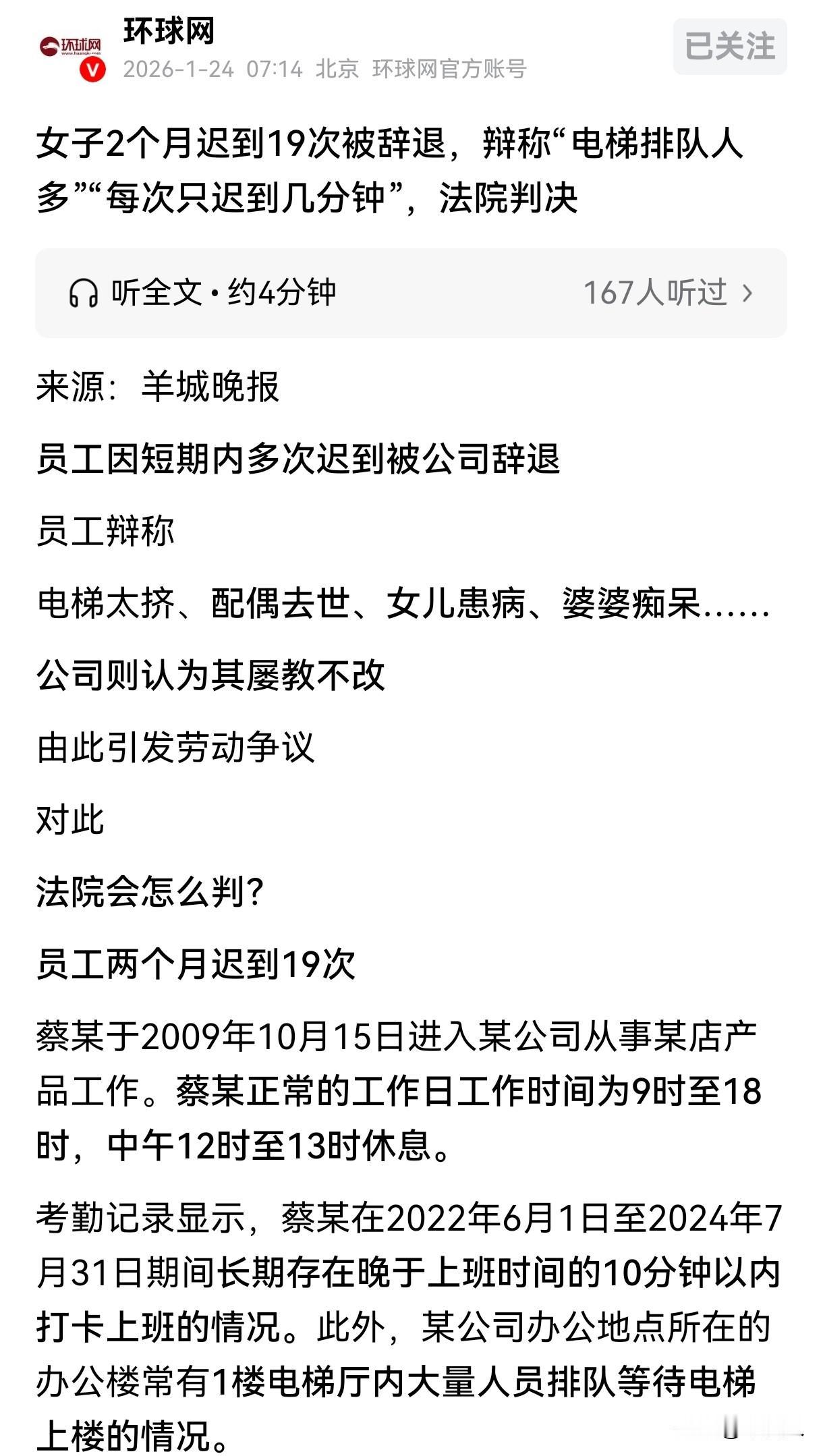 上海,女员工经常上班迟到,领导找她谈话,女员工说自己丈夫去世,女儿患病,婆婆痴呆,每天早上家里很多事情。领导体谅女子不易,给她机会,让她以后不要迟到,女子收敛一段时间后,到了次月,竟然整整迟到了14次,还说自己每次只迟到几分钟,没有影响工作。可公司却说她严重违纪,让她收拾东西走人,女子不服,将公司告上了法庭,可结果傻眼。 蔡女士是公司的老员工,在公司上班10多年,按理说对公司的规定是非常熟悉的,可她从2022年6月开始,一直存在迟到的现象,但是她每次迟到的时间都在10分钟以内。 一开始公司考虑到她的不容易,也没有过多追究,只是多次警告她,让她不要迟到,好好上班。可蔡女士依旧我行我素,仍然多次迟到。 2024年6月,公司派人和她谈话,蔡女士为自己辩解,说自己丈夫去世、女儿患病,婆婆痴呆,自己一个女人,要照顾老人孩子,每天早上家事太多,属于特殊情况,希望公司能够体谅一下自己。 而且自己每天迟到的时间并不长,有时候是在楼下等电梯,办公楼的电梯每次都要排长队,有时是打卡机没有网络或者出现其他故障,导致自己没有打上卡。 尽管公司认为蔡女士说的这些都不是上班迟到的正当理由,但是考虑到她在公司工作了10多年,之前也一直兢兢业业在上班,决定给她改正的机会,只要她以后不经常迟到,公司也就不做惩罚了。 谈话后,蔡女士确实也收敛了一段时间,迟到的次数明显减少了,就当公司以为蔡女士能安心工作,情况好转时。 可到了次月,蔡女士又开始频频迟到,2024年7月,她一个月内竟然迟到14次,再让她这么继续下去,其他员工有样学样,公司还怎么管理。 多次警示无果后,公司以蔡女士迟到次数较多,构成严重违纪且已达到了可辞退的标准为由,跟她解除了劳动合同。 蔡女士却不服,认为公司开除自己是没有道理的,自己在公司工作15年,没有功劳也有苦劳,自己迟到,实在是事出有因,并且自己虽然迟到了10多次,但是这些迟到的时间加起来也就69分钟,根本没有影响到工作。 即使自己确实违纪了,但是公司也不至于将自己给开除。 她认为公司将自己开除,属于违法解除劳动关系,申请劳动仲裁后,双方对结果都不满意。蔡女士又一纸诉状,将公司告上了法庭。 对于蔡女士提出的办公楼电梯要排队,自己家事很多,迟到情有可原,公司却认为蔡女士每次迟到的时间并不长,她完全可以每天早10分钟从家里出发,并且家庭原因也不能成为其违反公司纪律的合理理由,如果实在有突发情况,她也完全可以跟公司申请晚到。 她的迟到并非偶然,而是习惯所致,这是态度问题,公司已经给过她很多次机会了,如果每个员工都像她一样,一个月迟到10多次,公司还怎么管理。 公司认为他们跟蔡女士解除劳动合同,属于合法解除,无需支付经济补偿金。 法院审理后认为劳动者严重违反用人单位的规章制度的,用人单位可以解除劳动合同。 蔡女士长期迟到的行为,严重违反了公司的规章制度,公司据此与她解除劳动合同,并无不当,于是驳回了蔡女士的诉求。 蔡女士不服,提起上诉,二审维持原判。 其实蔡女士每天早点从家里出发,提前一点到公司,就不会造成如今的局面。 一个月扣掉双休,工作22天,迟到14天,三分之一的时间都在迟到,虽然每次都在10分钟以内,但是也属于迟到的情况,如果公司长期睁一只眼闭一只眼,对其他正常上班的员工来说,也是不公平的。 有老板分享了自己的经历,这样的员工自己也遇到过,开始每个月迟到五六次,谈话后,没处分,第二个月迟到十五六次,再次谈话,说再迟到就辞退,可没执行。 没想到对方开始旷工,上班经常找不到人,各种理由,有时说去看病,有时说买房办手续去了,或者家里老人去世,实在没办法,忍无可忍把对方给辞退了。 也有朋友说没有规矩不成方圆,既然公司制定了这些规章制度,按照制度办事就可以了,不然一盘散沙,还怎么好好运营。 但是也有网友说迟到几分钟,应该不算迟到,公司这样做,也太不近人情了。 对于此事,大家怎么看?公司的做法过分吗?