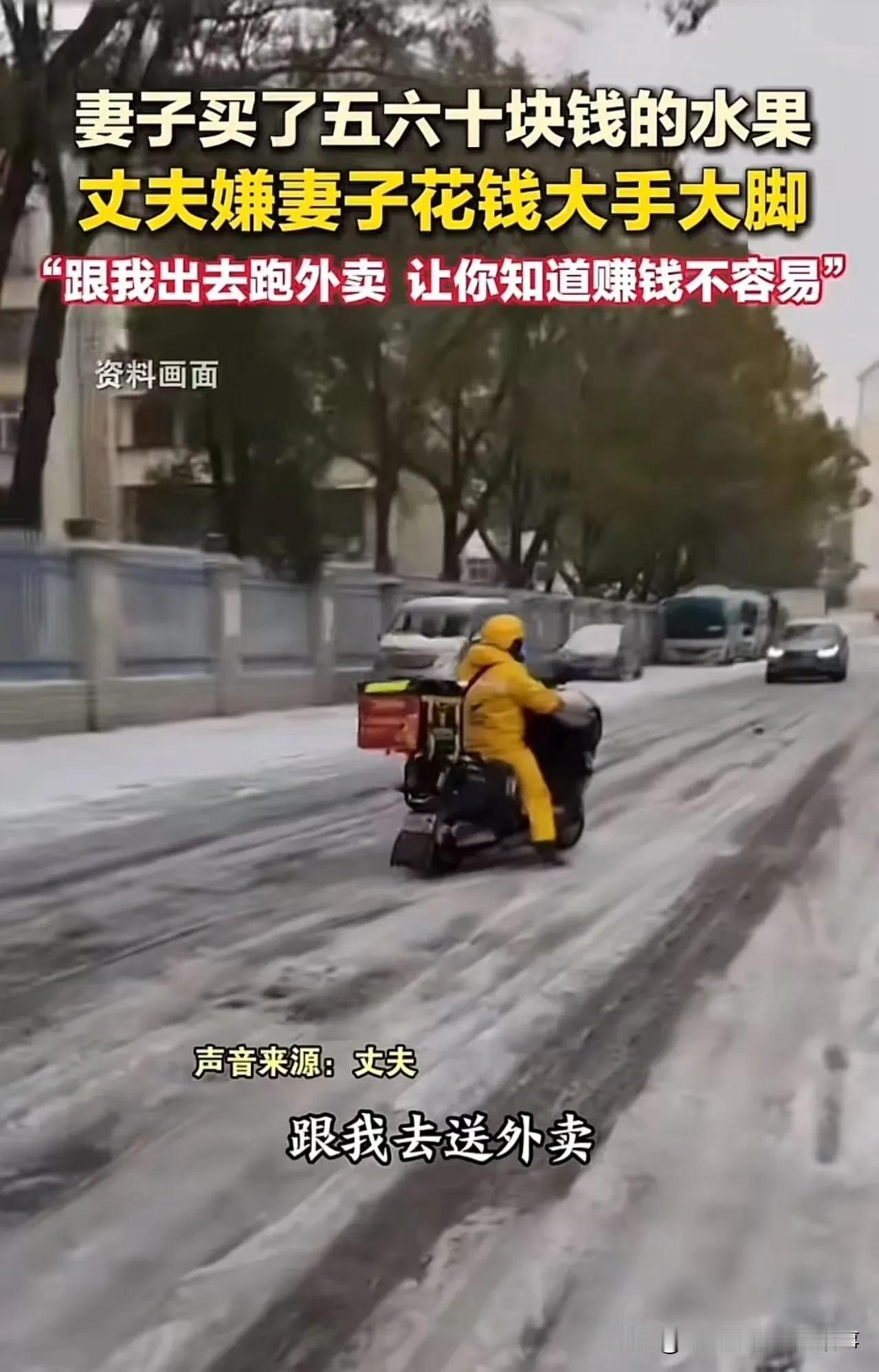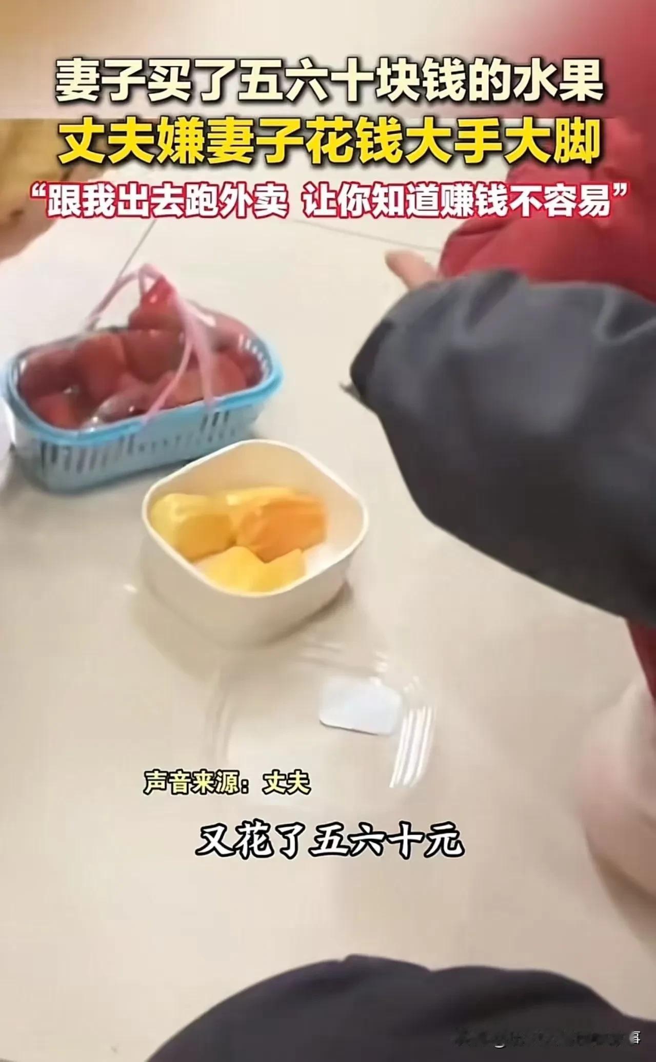 这事核心是消费认知错位+情绪沟通失控,暴露夫妻间赚钱辛苦的共情缺位,五六十块水果不算大手大脚,冷嘲热讽远伤感情。 关键问题点 - 消费层面:日常水果五六十元属普通家用开销,不算铺张,丈夫把辛苦具象化(15元/单),实则是焦虑转嫁,而非真计较钱。 - 沟通层面:丈夫用“必须跟去送外卖”的命令式语气,没换位思考妻子持家需求,反而用指责施压,极易引发矛盾。 - 核心矛盾:赚钱不易该共情分担,而非互相苛责,妻子买水果是家庭刚需,丈夫的委屈该说辛苦而非嫌弃。 理性相处建议 1. 丈夫:赚钱累可坦诚说“送外卖一单15块,跑半天才够买水果,咱们以后按需买更省心”,别指责,共情比说教管用。 2. 妻子:可回应“知道你赚钱辛苦,水果是家里吃的,下次咱们挑性价比高的,你在外跑也多注意保暖”,先接情绪再聊消费。 3. 相处核心:日常小额开销别算细账,赚钱的委屈互相倾听,消费观差异慢慢磨合,别让辛苦磨掉温情。 素材来源于网络