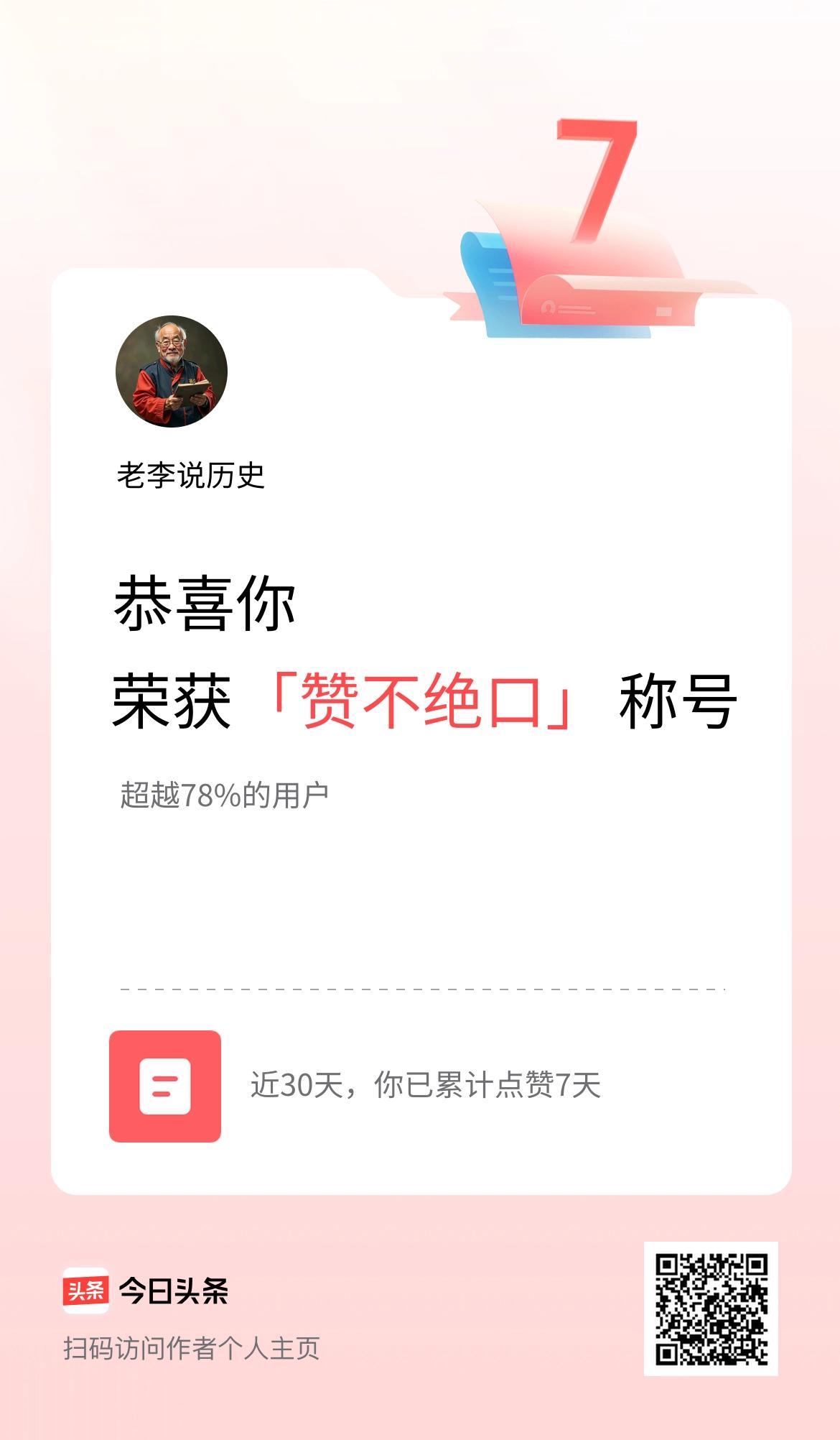 我在头条30天内点赞打卡7天,获得“赞不绝口”称号