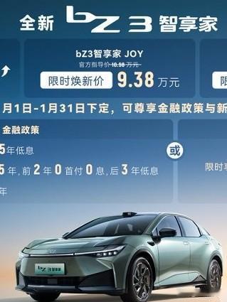 一汽丰田2025年的年末,给我们带来了一匹新能源市场的黑马。丰田品质B级的纯电家轿,bZ3智享家限时的焕新价仅9.38万元起上市了! 丰田bZ3在空间表现上十分突出,它的车身尺寸为4725/1835/1475mm,轴距达到2880mm,让后排的空间非常宽敞,后备箱容积高达439L,后排座椅放倒后可扩展至1350L。让我们日常通勤,全家人外出外出露营能装下所有的行李。 丰田bZ3智享家的智能驾驶 ,全系标配Toyota Pilot驾驶辅助系统,包含全速自适应巡航等功能。而且顶配MAX的车型它搭载了Momenta 5.0辅助驾驶系统,并配备了32个感知硬件,含1颗激光雷达,可实现INP导航驾驶辅助等功能,让全家人的出行既智能、又舒适、又有家的感觉。