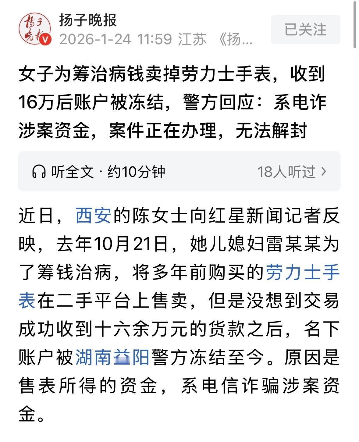 陕西西安,女子为了筹钱治癌症,把劳力士表放在二手平台上卖,后被一买家以16万4的价格收走,打款时,对方说银行下班了,走平台不方便,问能不能私下转账?女子同意了,谁料,第二天她的账户就被冻结,女子这才知道,那笔救命钱竟然涉诈,她觉得自己也是受害者,可帽子叔叔表示,女子不走平台交易,给了他人可乘之机,也有责任,如果她能把这16万4退给那名被骗的受害人,对方出具谅解书后,这事就能从轻处理。 这世上的倒霉事,有时候专挑苦命人下手。 陈女士的儿媳妇雷女士,10年前就得了甲状腺癌,当时手术做得挺成功,一家人以为没有什么后顾之忧了。 谁承想,病魔这东西不讲武德,今年又杀了个回马枪,癌细胞转移到了肺里。 这一病,不仅人受罪,钱包更是捂不住。 小两口原本经营着一家烧烤店,想着靠双手挣钱治病。可这两年店里生意冷清,一直在亏钱,眼看就要撑不下去了。 没办法,家里人一合计,把多年前买的一块劳力士手表拿了出来。 这表是家里最值钱的东西了,现在为了救命,只能忍痛卖了。 10月21号这天,买家上门了。 对方是个二手钟表公司派来的验表师,他在雷女士的店里,拿着表仔细细地看、查吊牌、核保修卡。 雷女士当时心里还踏实了点,想着正规公司应该靠谱。验完货,双方谈好16万4千块钱。 谁料,事情坏就坏在打款这个环节上。 到了下午5点多,验表师说表没问题,要拿走。 这时候提到转账,对方说银行对公账户下班了,走公司流程慢,不如直接让背后的买家个人打过来,这样快。 雷女士一家拿钱心切,加上看了对方的营业执照,觉得应该没啥问题,就答应了。 只要钱到账就行。这是他们当时唯一的念头。 钱确实很快到了,16万4,一分不少。验表师拿着表就走了。 雷女士看着手机上的到账短信,心里松了一口气,想着明天就能拿这笔钱去医院交费了。 可这口气还没松到底,第二天一早,雷女士去买早点刷卡,提示余额不可用。 她再查手机银行,发现账户突然被冻结了。 这下她彻底慌了神,赶紧跑去派出所报警。 警察一查,说这钱不是买表的钱,是湖南益阳那边电信诈骗案的脏钱。受害人的钱被骗走后,转了好几手,最后一站就是雷女士的账户。 按照法律程序,涉案资金必须冻结。 陈女士急得直哭,赶紧把手上所有的交易证据都翻了出来。包括二手平台的聊天记录、店里的监控视频、验表师验货的全程录像。 她一遍遍跟湖南的警察解释,说我们真不知道这是诈骗钱啊!我们是正经卖表的,表也给他们了,我们也是受害者啊! 警方那边查得也很紧。 根据线索,那个验表师拿了表之后,根本没回公司,直接打车去了机场,把表交给了一个接头人。 这接头人又转手给了另一个人,最后这表就像人间蒸发了一样,不知道去向。 好消息是,警方顺藤摸瓜,已经抓住了中间倒手的两个人,正在顺线追表。 现在的局面特别尴尬:表没了,钱也被锁在银行里取不出来。 雷女士还在医院等着钱救命,肺癌的治疗一天都不能停。 陈女士代表儿媳去跟警方沟通,希望能看在治病救人的份上,先把账户解封了,或者把表追回来。 但警方的态度很坚决:法大于情。 益阳警方的负责人说得很直白:这钱是受害人的血汗钱,我们不能因为你们家有病人就违规解冻。 而且你们在这个交易里也有过错。正规平台交易有担保,你们非要私下转账,这就给了犯罪分子可乘之机。在民事上,你们是有责任的。 警方甚至提出了一个折中方案:既然表也没了,钱也被认定为赃款,雷女士一家如果能把这16万4退赔给受害人,受害人可以出具谅解书,这事儿或许能从轻处理。 但陈女士一听就炸了,死活不同意。 她说,我们也是受害者,我们把表给他们了,是他们拿脏钱来骗我们的表!凭什么让我们再掏16万赔给别人? 陈女士觉得这太冤枉了,如果是我们犯法了,该坐牢坐牢,但现在我们是正常的买卖,货也交了,钱也收了,为什么要我们买单?我儿媳都病成这样了,正需要钱,哪还有钱退? 这事儿就这么僵住了。 警方表示,案子还在查,只要在法定期限内,账户就得一直冻结。 陈女士现在特别后悔,她在电话里跟记者说,我们就是法盲,不懂这些弯弯绕绕,就想着赶紧拿钱救命。谁知道这一脚踩进了雷区。 目前,那块劳力士还在追查中,账户依然冻着。 根据《刑法》第64条:犯罪分子违法所得的一切财物,应当予以追缴或者责令退赔;对被害人的合法财产,应当及时返还。 虽然雷女士交付了手表且不知情,但其未走平台担保、直接接收个人大额转账的行为存在重大过失,可能不符合“善意取得”的构成要件。 但是,雷女士在承担责任后,有权向验表师及买家进行民事追偿。 对此,你怎么看? 关注@运良说法 学法律知识不迷路