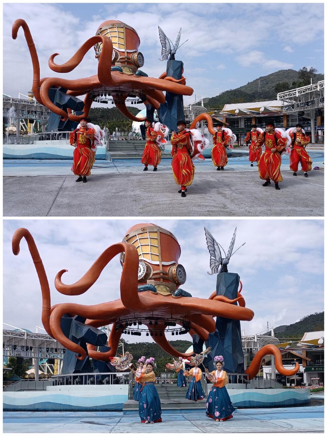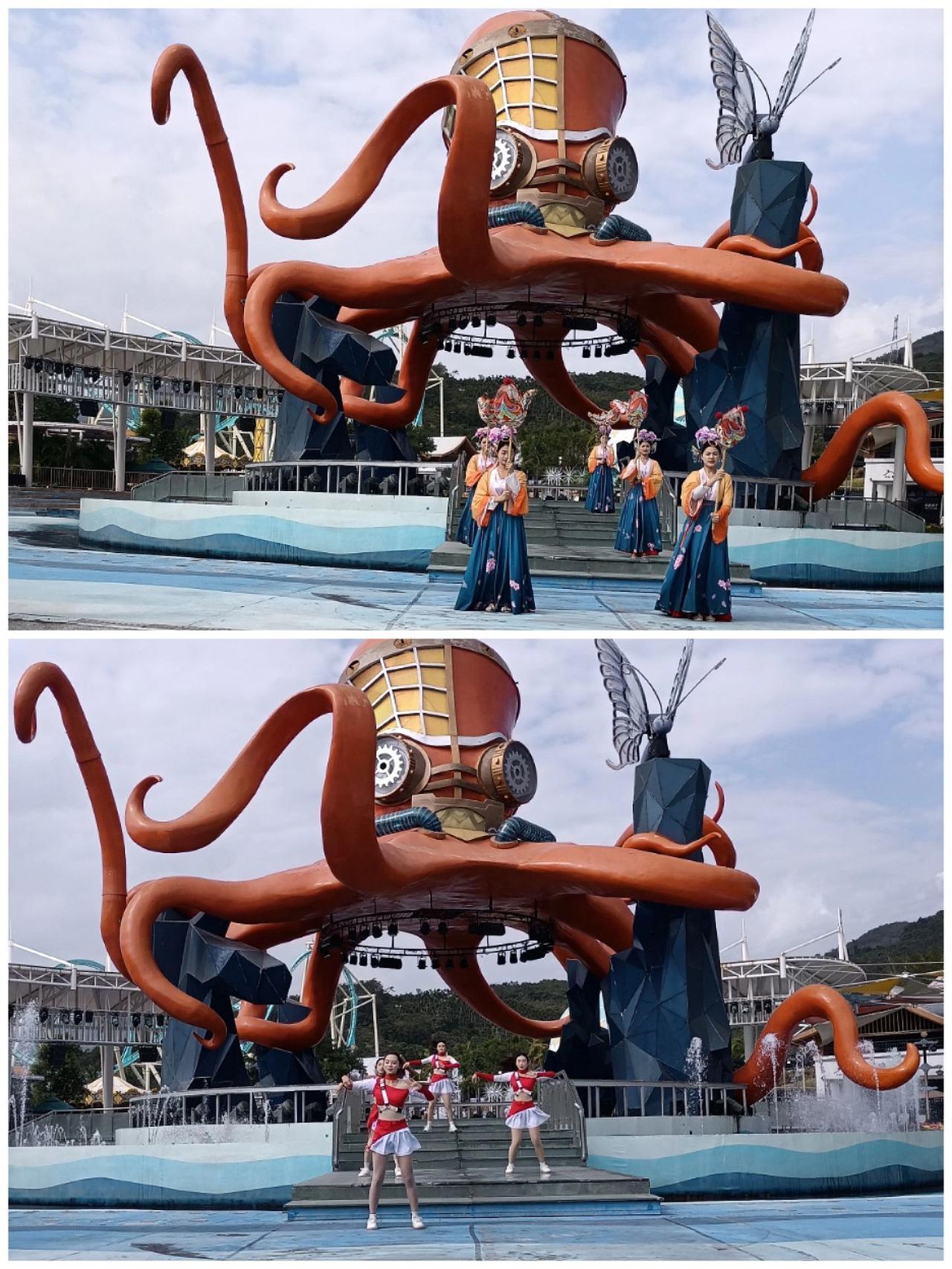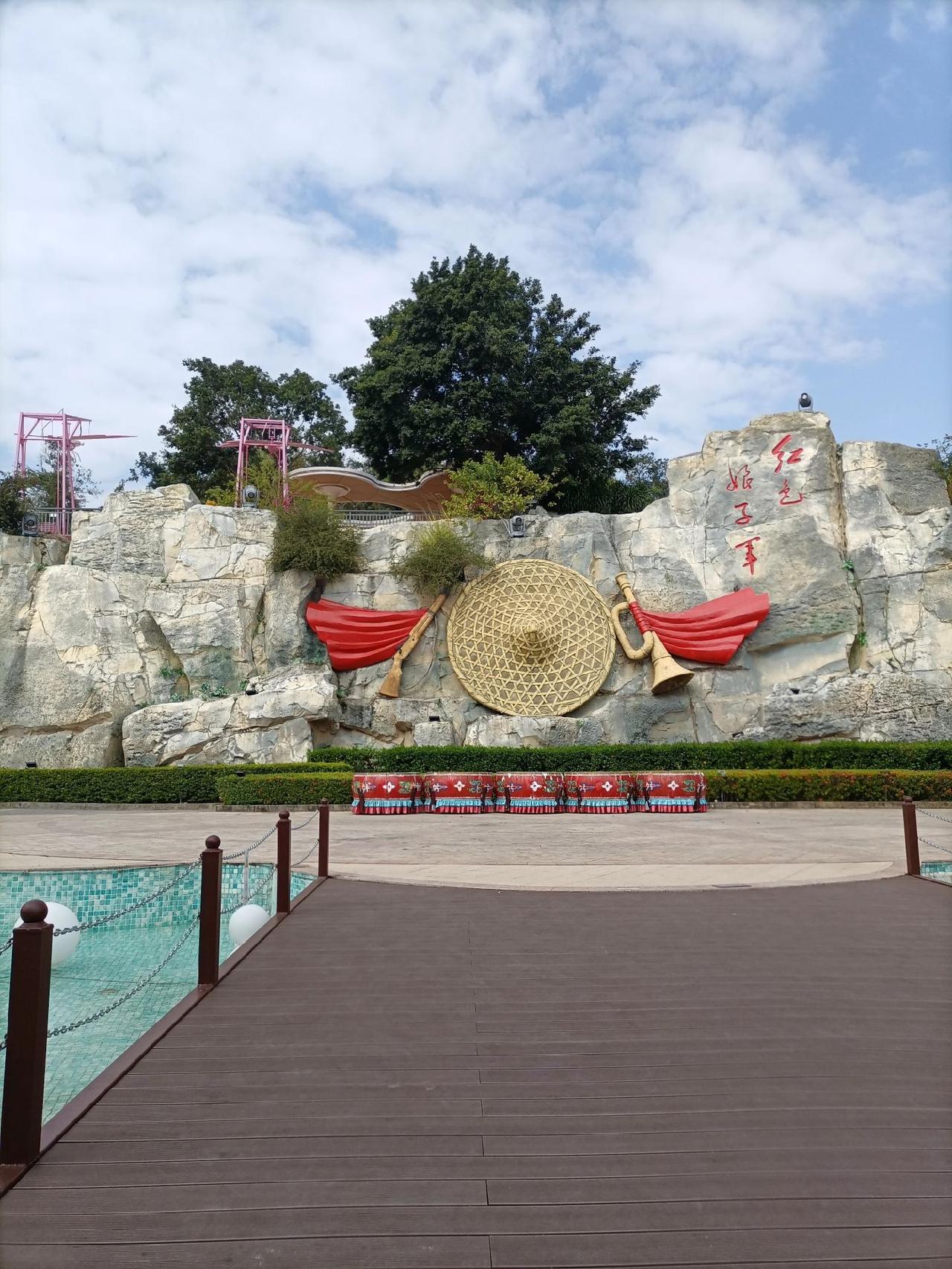 三亚红色娘子军公园,在这个章鱼大殿前,演员们近距离表演了民族和现代舞蹈(图1-2),观众不多,演员们还是倾情表演。 公园分为两部分,游乐园造型奇特(图3-4),风光秀丽(图5-6);红村(图7)介绍了红子娘子军当时的战斗事迹(图8-9)。在演艺厅上面电视大屏上还观看了电影红色娘子军后半段,听着熟悉的旋律,重温过去的青春;可惜沉浸式三D演出要晚上7点半才开始,要等很长时间,放弃了。 海南 红色娘子军 公园 表演