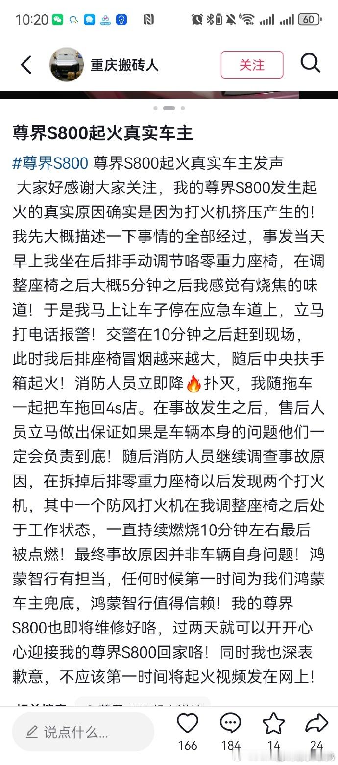 尊界S800后排起火事件最后反而证明在设计时已经充分考虑了材料的防火设计,扶手箱区域所采用的陶瓷纤维防火层有效阻隔了热量的传导与火焰的扩散。鸿蒙智行在发布会上只讲主要技术,这些细节不说不代表没做,否则一场发布会三天都开不完。真正的关心呵护往往来自默默的付出,沉默的守护远比任何一场盛大的发布会、或是流量爆棚的直播更值得信赖。真正的爱,不是围绕耳边的甜言蜜语,更不需要剖开全身来证明心意尊界S800 鸿蒙智行