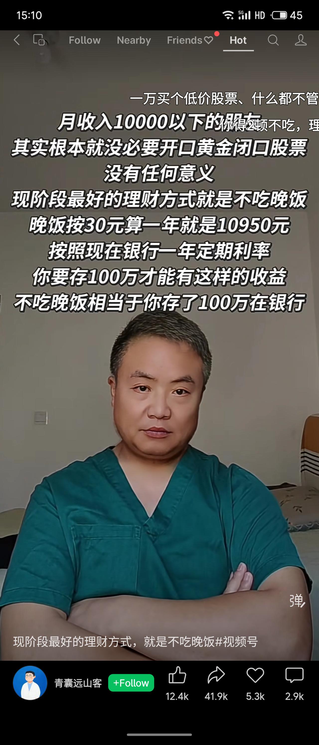 提出一种另类理财观:认为与其钻研股票黄金,不如直接省下每晚30元的晚餐费。如此一年可省约10950元,作者换算称这相当于在银行拥有百万存款的利息收益,强调节约即是最稳妥的“投资”。
