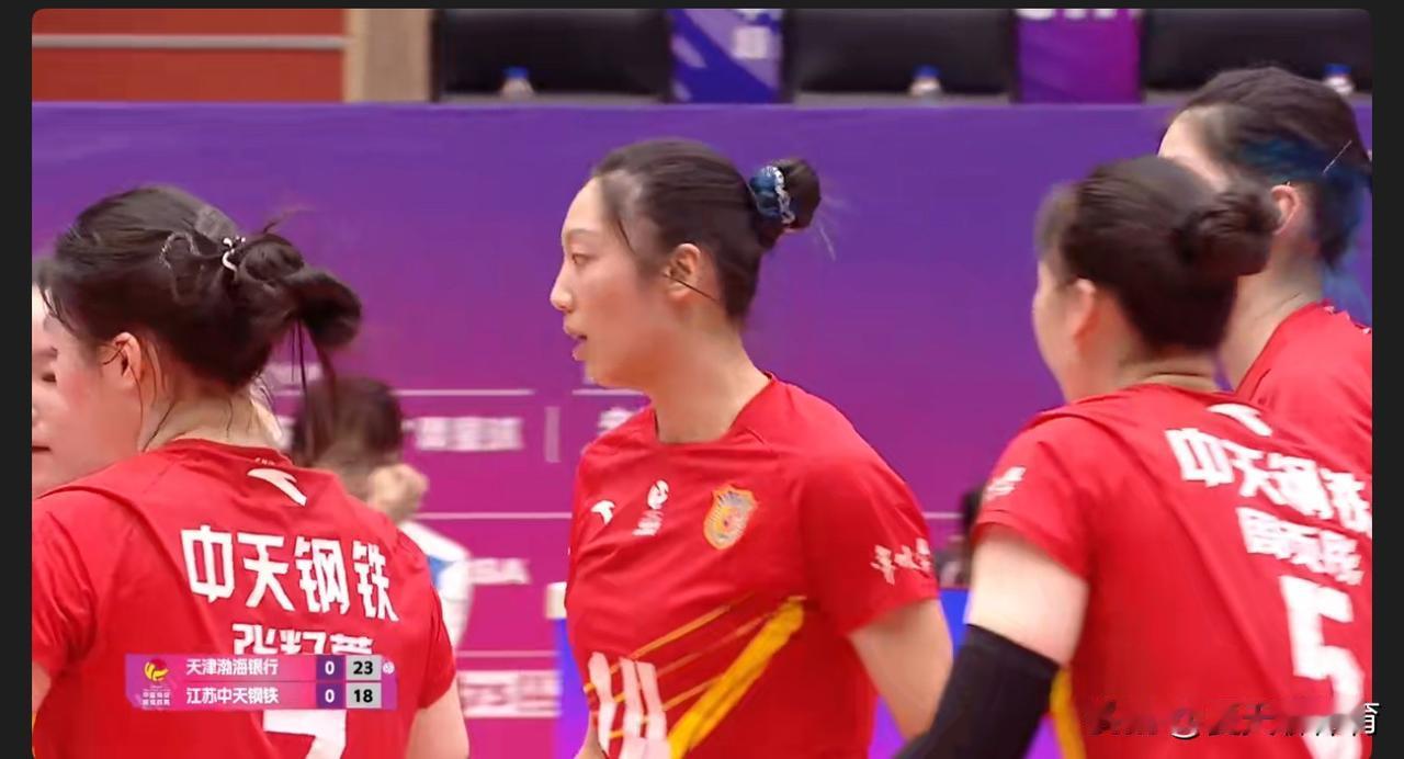 江苏女排第一局被天津女排魔鬼主场给吓到了!全队没有一个在线的,都在梦游,乱成一锅粥了,感觉被天津给做法了,一传满天飞,吴梦洁也不在线就完蛋了!天津女排打得很聪明,打打吊吊,防守也很顽强,这才是自己的特点和优势!施海荣临场应变是真的慢啊,唐欣没发挥出来,还总是失误送分!