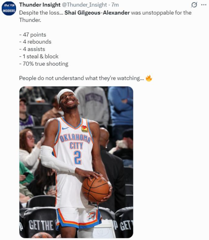 NBA常规赛爆出超大冷门,联盟第一的雷霆队114-117不敌联盟 倒数第一的步行者队,这场比赛谁也想不到雷霆会一败涂地,首节开场OKC就落后11分之多,上半场雷霆最多落后到17分,雷霆一直被联盟倒一的步行者压制到最后,SGA无论怎么拿分都无法逆转。 这场比赛之前,步行者是10胜35负(联盟倒数第一),雷霆是37胜8负(联盟第一),但开场雷霆并没有展现他们顶级的防守强度,很明显这支OKC过于轻敌自大,西卡、内姆布哈德、内史密斯、沃克冲入内线都太轻松。 最终步行者5人上双+三人20+暴打雷霆,OKC这边只有两人20+,SGA在末节狂砍15分,全场比赛35分钟,28中17,三分4中1,罚球12中12拿到47分4篮板4助攻1抢断1盖帽,命中率60.7%,真实命中率70.6%,正负值+4。 此役SGA创造多项纪录: 1.这场比赛SGA延续了自己连续116场20+; 2.他拿到跟库里一样多的本赛季45+; 3.2026年SGA拿到7次30+仅次于东契奇; 但这场比赛对于SGA来说也是耻辱一战, 1.此役后雷霆37胜9负确定无缘15-16赛季勇士创造的73胜; 2.雷霆目前胜率80.4%,还不及上赛季82.9%;(别说70胜了,就算冲击上赛季的68胜都难) 雷霆队的夺冠概率再度下滑1%,目前是43%,虽然也是断崖第一,但随着他们之后继续吞下失利,他们的夺冠概率会持续下滑,本赛季的雷霆输掉太多不该输的球。
