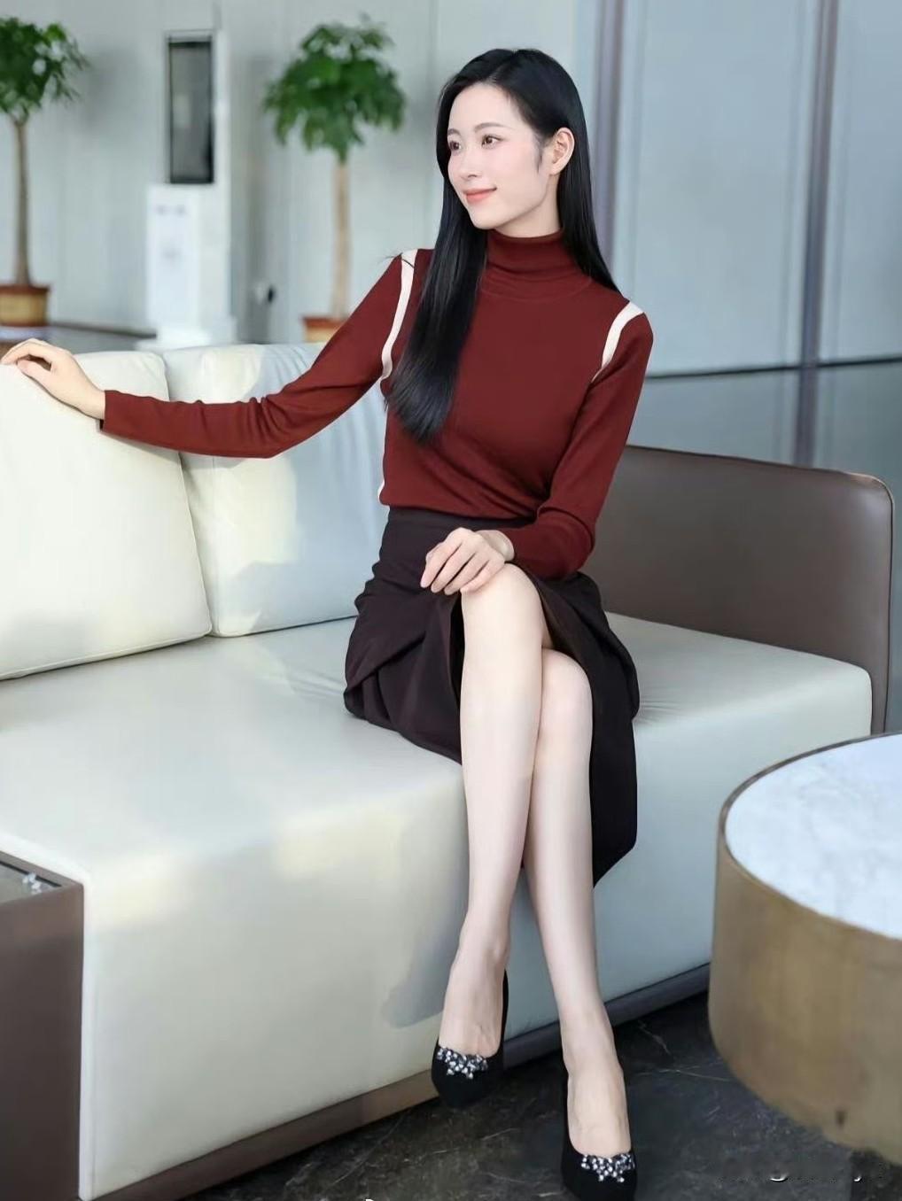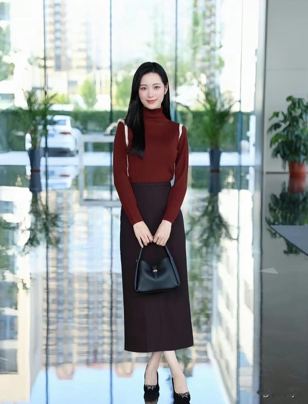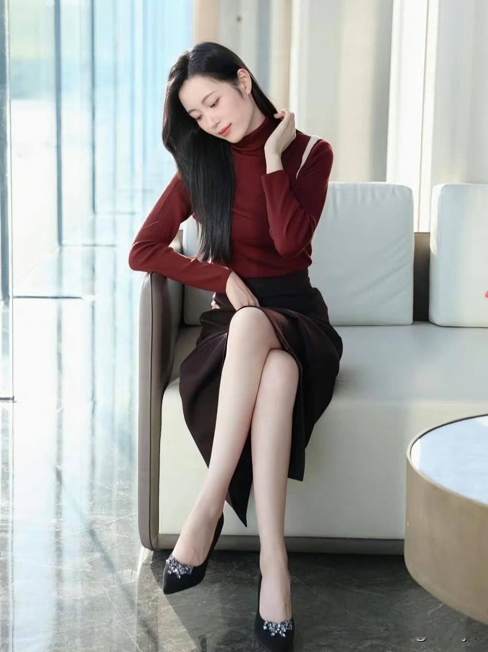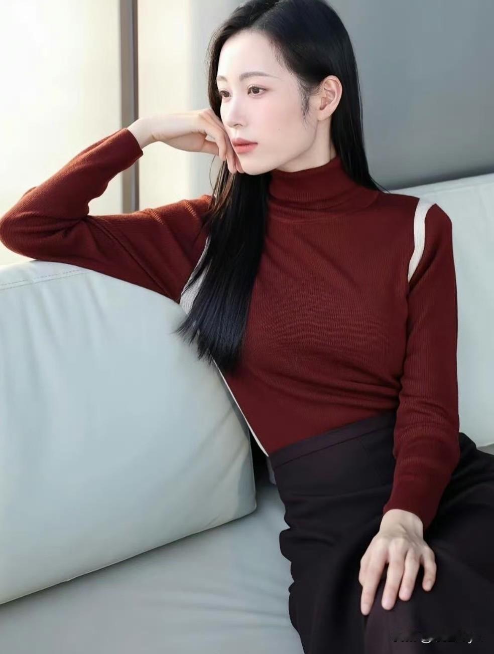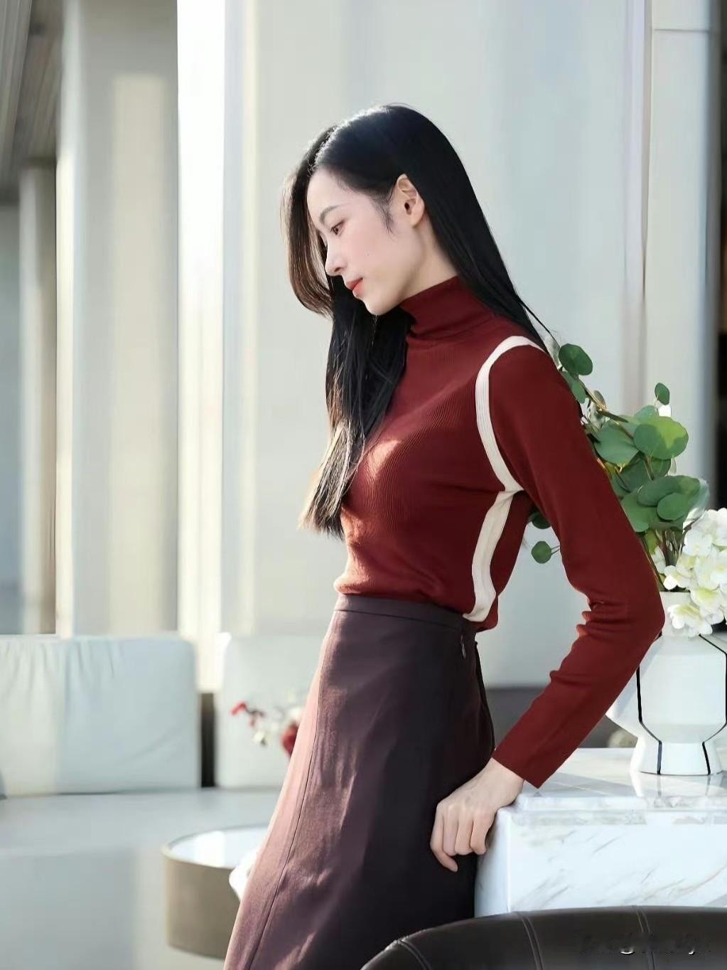 红棕高领针织衫,深棕开叉半裙,同色系叠穿温柔又高级~ 修身版型衬得身材超绝,皮肤白到发光!