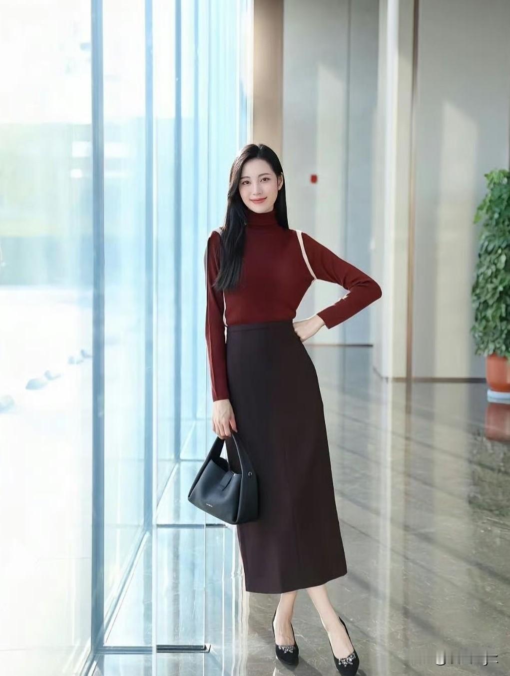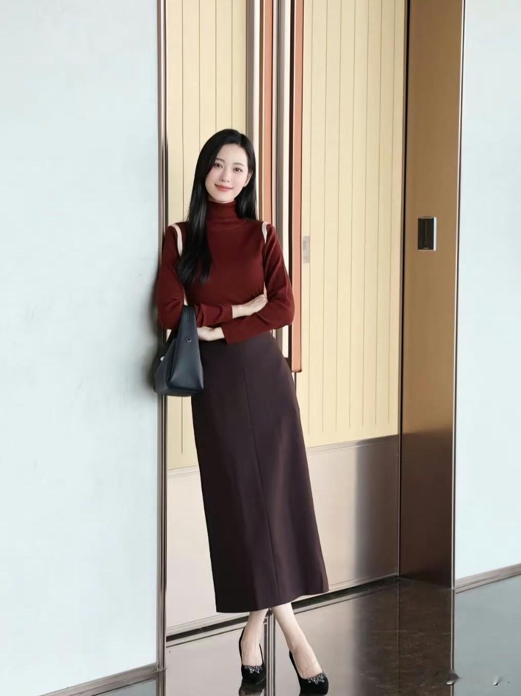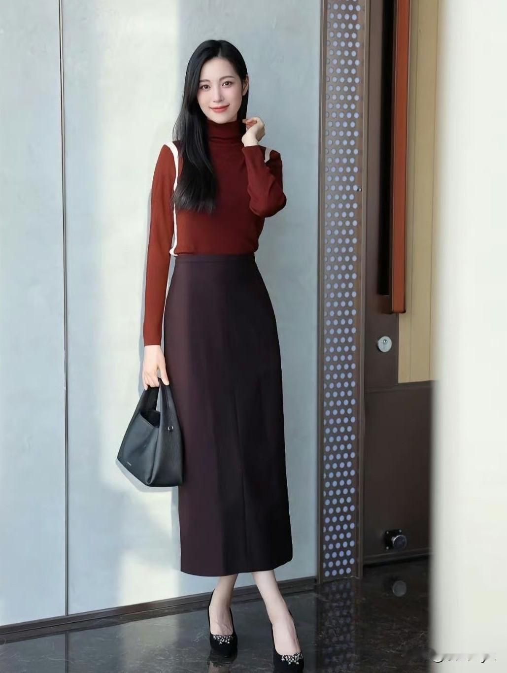 红棕高领针织衫,深棕开叉半裙,同色系叠穿温柔又高级~ 修身版型衬得身材超绝,皮肤