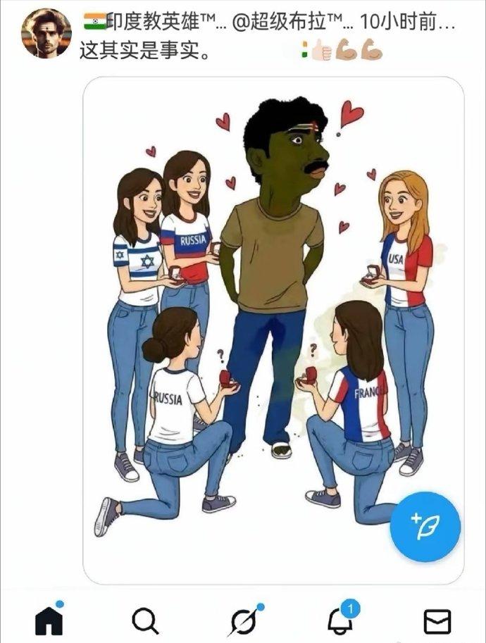 印度人的自信真是无敌了,不知道韩国人看了会咋说。 这图让人笑到打鸣,印度网友拿着这张图一本正经地说 “这其实是事实”,这迷之自信直接把大气层都捅破了。 画面里显示一个黑人小哥被各国妹子围着示好,有美国、法国、以色列,俄罗斯的居然有两个。 印度网友把这当成印度男性魅力征服全球的 “铁证”。 这波操作主打一个 “万物皆可印度制造”,直接把 “宇宙第一自信” 焊死在自己脑门上了。 这图本来就是个讽刺崇洋媚外的梗图,结果被他们彻底玩反了。 现在就好奇隔壁同样以 “宇宙起源” 为傲的韩国网友看到会不会连夜召开紧急会议, 申请把 “宇宙第一自信” 概念申遗? 毕竟在 “迷之自信” 这块这俩国家简直是卧龙凤雏, 高低得当场来一场掰头,争夺一下 “宇宙第一” 的冠名权。
