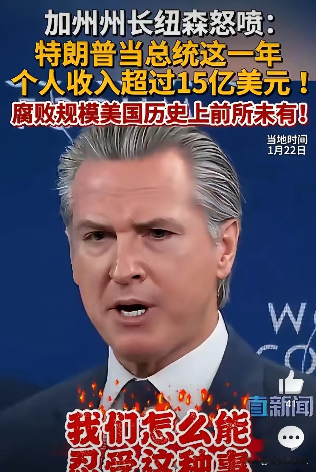 非常佩服这个美国加州州长加文.纽森。他在参加世界经济论坛被访问时,直接怒喷斥责特朗普,说特朗普在过去的一年里,各类收入总共15 亿美元,纵观美国历史上都没有像特朗普这样腐败的美国总统,可以说是史无前例了!并说就应该公开谴责特朗普! 纽森这次在世界舞台上的炮轰,绝不是一次简单的政治口水战。他指出的“15亿美元收入”和“史无前例的腐败”,像一把尖刀,试图刺破特朗普商业帝国与总统权力之间那层越来越薄的窗户纸。这背后,是特朗普家族将政治影响力变现为真金白银的疯狂操作。 看看特朗普的财务报告吧,那简直是一本“点金术”指南。他名下豪华地产和俱乐部收入数以亿计。但这只是冰山露出水面的部分。更惊人的是他构建的虚拟货币帝国。他与家人创立的加密币公司,一次代币销售就让他赚取超过5700万美元。他本人背书的“特朗普币”,市值一度高达16亿美元。 这些虚拟货币,成了新型的“政治献金”渠道。外国资本通过购买这些“币”,就能轻松将资金输送到特朗普家族手中。作为回报,某些购买者面临的政府诉讼被暂停了,还有更多人获得了与总统共进天价晚宴的“门票”。这哪是投资,分明是标好价码的“觐见”机会。 纽森对这一切的愤怒,不仅停留在口头。作为加州州长,他必须直面特朗普政策带来的现实冲击。例如,特朗普曾向洛杉矶派遣军队,仅此一项就耗费了纳税人近1.2亿美元。而当福克斯新闻散布关于他的不实报道时,纽森选择了直接起诉,索赔金额高达7.87亿美元。他用法律和舆论作为武器,进行反击。 更讽刺的是,特朗普在疯狂敛财的同时,竟试图让美国司法部评估,是否能用2.3亿美元纳税人的钱,来补偿他本人因一系列调查所产生的所谓“损失”。这种“自己调查自己、自己补偿自己”的戏码,恐怕连小说都不敢这么写。 面对这样一个将权力与商业彻底混搭的总统,传统的监督机制似乎失灵了。司法系统被安插了“自己人”,国会也被忠诚者主导。难怪有法律专家痛心地说,这简直是对美国的一次“掠夺”。 纽森在世界经济论坛上的怒吼,是一个警告。他提醒世界,美国总统的职权正在被前所未有地私有化、商业化。当一国元首的個人财务与国家利益纠缠不清时,他做出的每一个决策,还能有多少是为了公众福祉?这个问题,不仅美国人民需要回答,全世界也在观望。 各位读者你们怎么看?欢迎在评论区讨论。 特朗普达沃斯演讲炮轰欧洲和加拿大你怎么看 特朗普经济霸权 丹麦怒怼特朗普 特朗普怒斥美国 加州反特朗普 加州起诉特朗普 斯塔-特朗普 美加州州长纽森