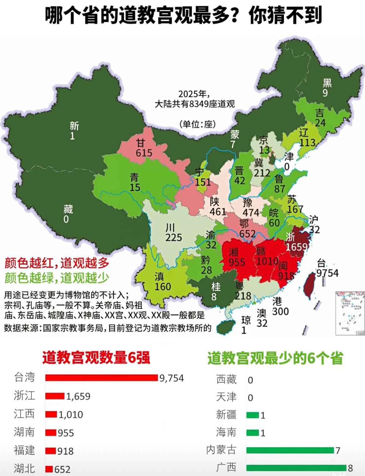哪个省的道教宫观最多呢? 没想到台湾的道教宫观最多,竟然有9754座之多。排名第二的是浙江,有1659座。排名第三的是江西,有1010座。 道教