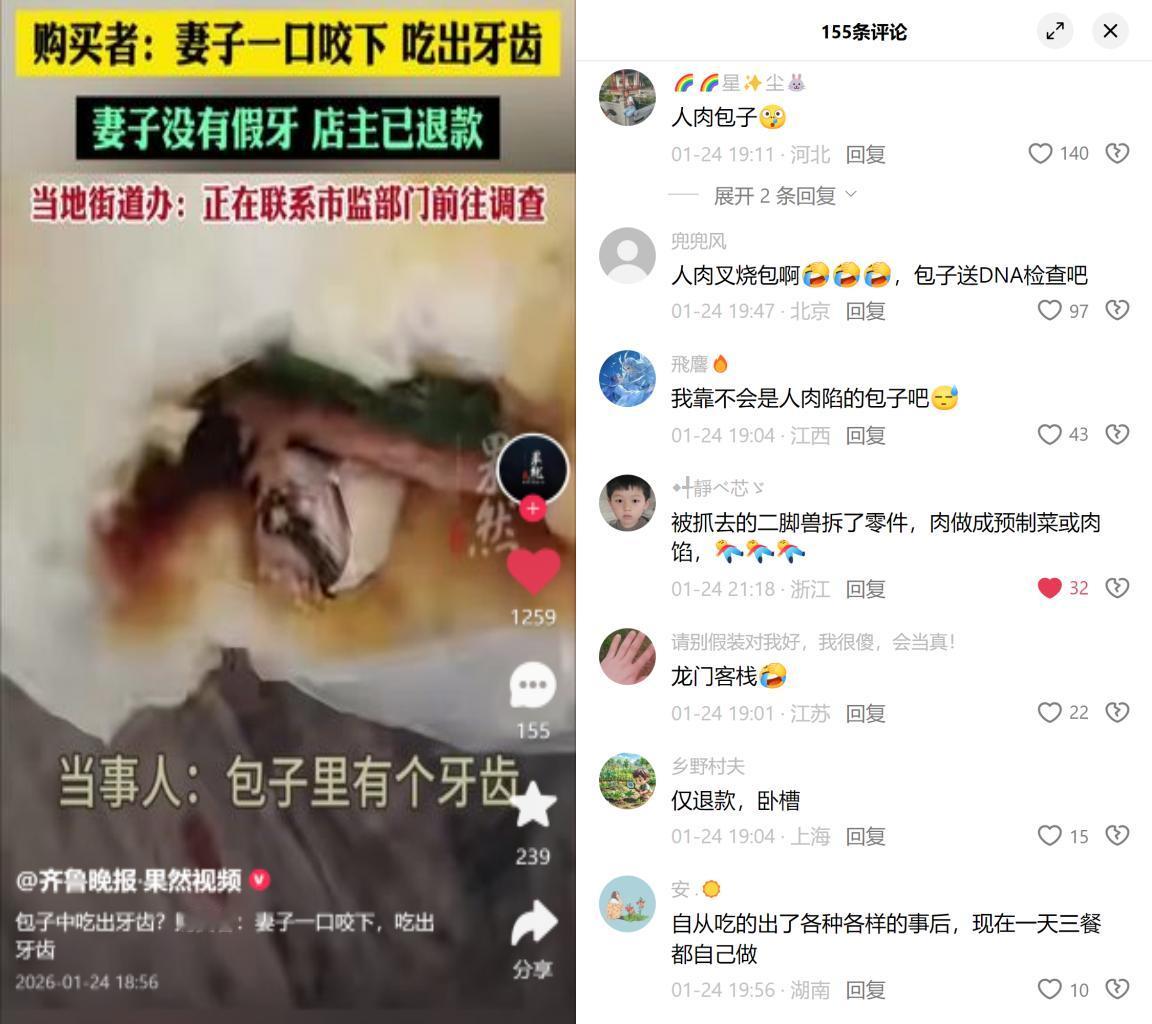 四川西充有对夫妻,昨天买了几个包子,妻子咬一口差点吐出来,嘴里卡着个像牙齿的东西。 男的说是23号买的,妻子没假牙,找店主退了钱,但店主没解释啥,现在相关部门已经去查了。 大伙儿全在刷人肉包子孙二娘,懂行的兽医早科普过:猪牙比人牙大一圈,门牙是弯的,牙根老长,跟人牙压根不是一回事。但为啥大家会往最恐怖的地方想?还不是因为现在吃的东西太没谱了,之前有边角料做馅的,有劣质肉混卖的,连包子里的肉是哪块猪身上的都没个准信,换成谁不得慌? 再说商家,就退个款完事?食品安全不是小事,光退钱跟没处理一样,这不是把消费者的担心当耳旁风吗? 现在就等相关部门的鉴定结果,但这事最让人闹心的,那个牙齿倒还在其次,关键是我们对吃进嘴里的东西,越来越没底了。