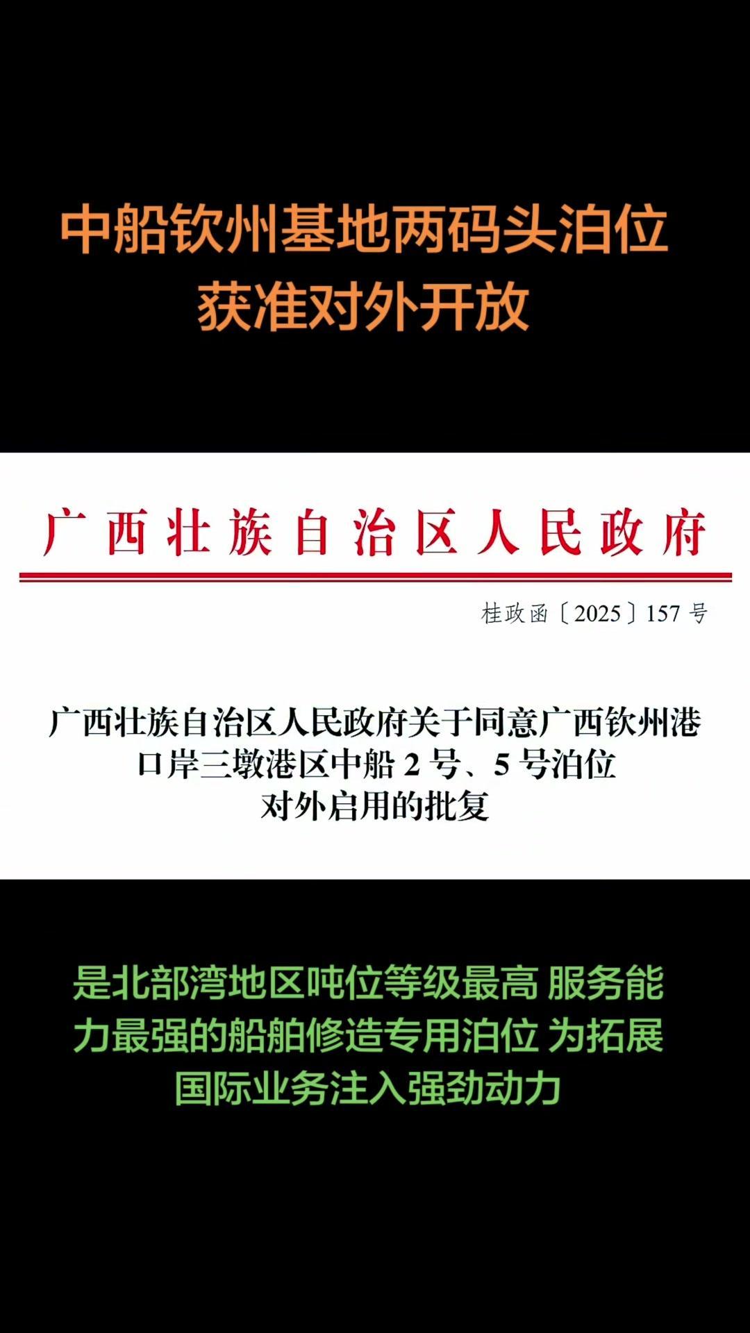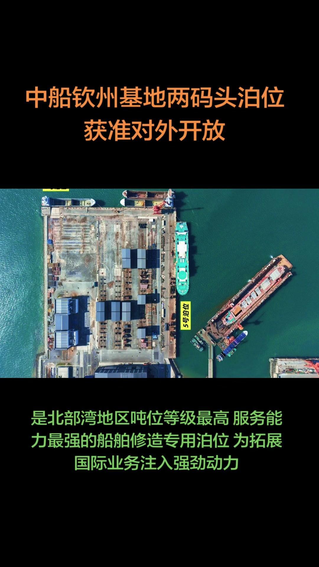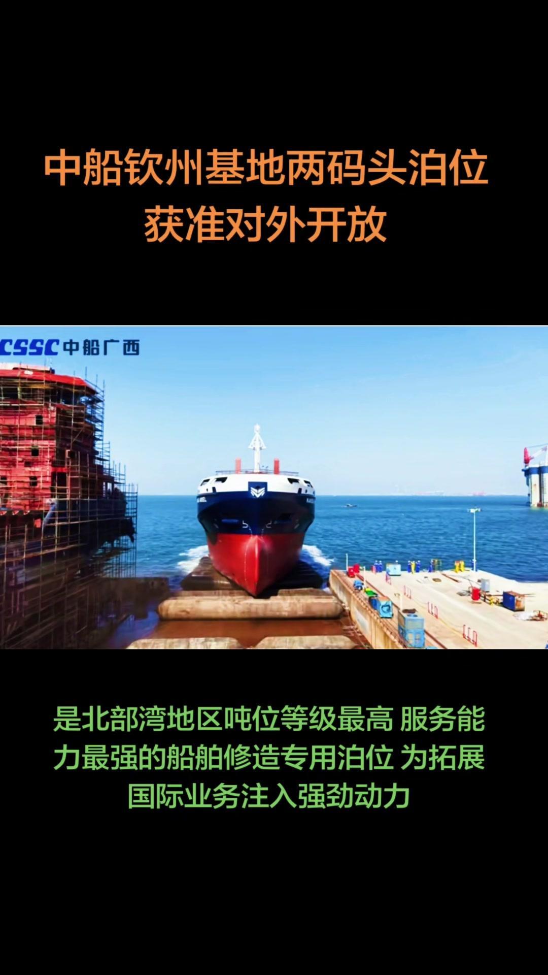 📢中船钦州基地两码头泊位获准对外开放,这对区域物流和外贸发展意义重大! 此次对外开放的两个码头,将大幅提升货物吞吐量,为周边产业提供更高效的运输支持。无论是大型船舶停靠还是货物装卸,效率都将得到显著提升,进一步优化了港口资源配置。 对当地来说,这不仅能推动外贸经济增长,还能促进相关产业链的发展,为区域经济注入新活力。对于企业而言,更便捷的港口条件意味着更低的物流成本和更广阔的市场空间。