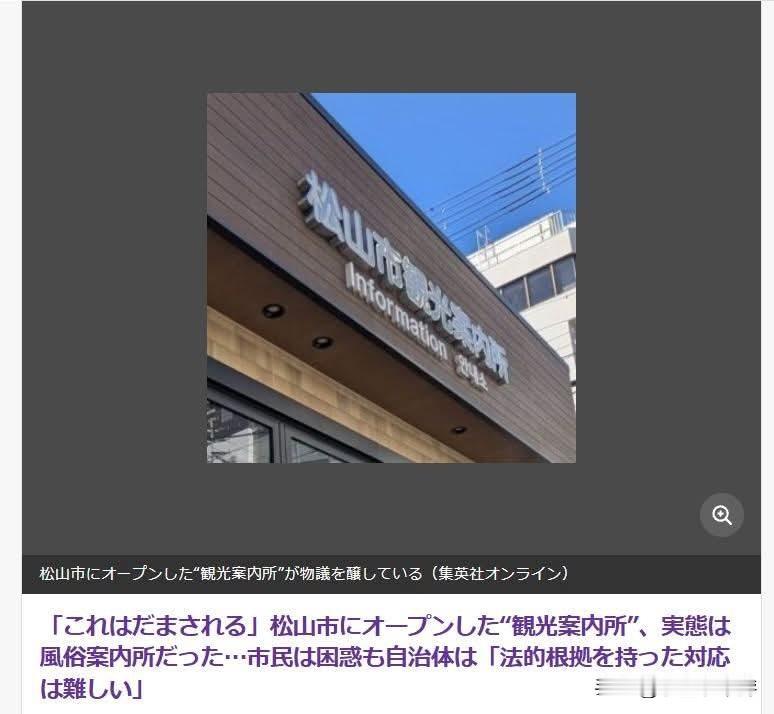 这个一眼看上去很正规的旅游服务中心,原来竟是专门介绍风月场所的啊.... 以下为日媒报道原文: 松山市惊现“伪”观光咨询处!外观像政府机关实则是成人场所信息站 官方叹:无法可管 2025年访日游客突破4200万人次,创下历史新高,带动了各地“观光咨询处”的需求。然而,近日在爱媛县松山市,一间名为**“松山市观光咨询处”** 的设施却在网络上引发热议,因为它的真面目是一间“未满18岁禁止进入”的成人风月场所咨询处。 隐藏在木质文艺风下的真相 这间位于松山市繁华街区的设施于2025年9月开业。其建筑采用大量木质色调,外观沉稳雅致,与日本各地政府运营的公立观光咨询站极为相似。 - 网友批评:众多网友在X平台(原Twitter)上痛批:“这绝对是为了坑外国游客”“第一眼看上去绝对会被骗”“这命名品味百分百是故意的,就是为了让人误解”。 - 实际地理位置:该店位于松山市最热闹的“二番町通”与“八坂通”交叉口,距离当地著名的“大街道商店街”不远,是游客极易误闯的黄金地段。 法规漏洞:名称竟不受管辖? 尽管东京都、大阪府、京都府等地均实施了《风月场所咨询业管制条例》,限制这类特殊行业咨询站不得开设在学校或图书馆附近,且名称需事先报备。 - 爱媛县的困境:爱媛县虽也有相关条例,但在去年10月的县议会质询中发现,现行规范**“并未针对名称作出具体限制”**。 - 官方回应:松山市政府表示已接到多起民众咨询“那到底是什么店”,虽对此感到担忧,但坦言:“由于缺乏法律依据,目前难以强制要求其改名。” 警方与中央政府的立场 警察厅公关室在回应采访时表示,现行《风月营业法》中并未对“风月场所咨询处(成人信息站)”的名称作出具体规定。这意味着,只要经营者在法律允许的地点开展业务,目前无法直接针对其“命名方式”进行处罚。