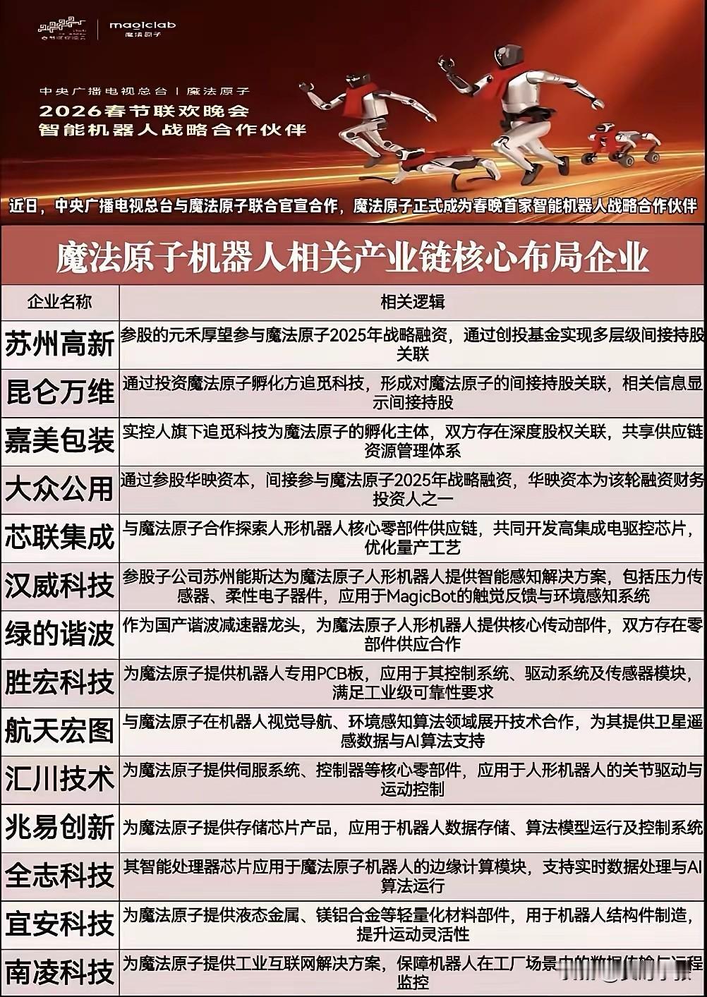 2026春晚智能机器人战略合作伙伴——魔法原子,产业链核心布局企业全梳理!从核心零部件到轻量化材料,从伺服系统到AI算法,覆盖人形机器人全产业链关键环节。苏州高新、昆仑万维、嘉美包装等企业深度绑定,芯联集成、绿的谐波、汇川技术等提供核心技术支撑,助力魔法原子机器人技术突破与量产落地,人形机器人产业迎来发展新机遇!