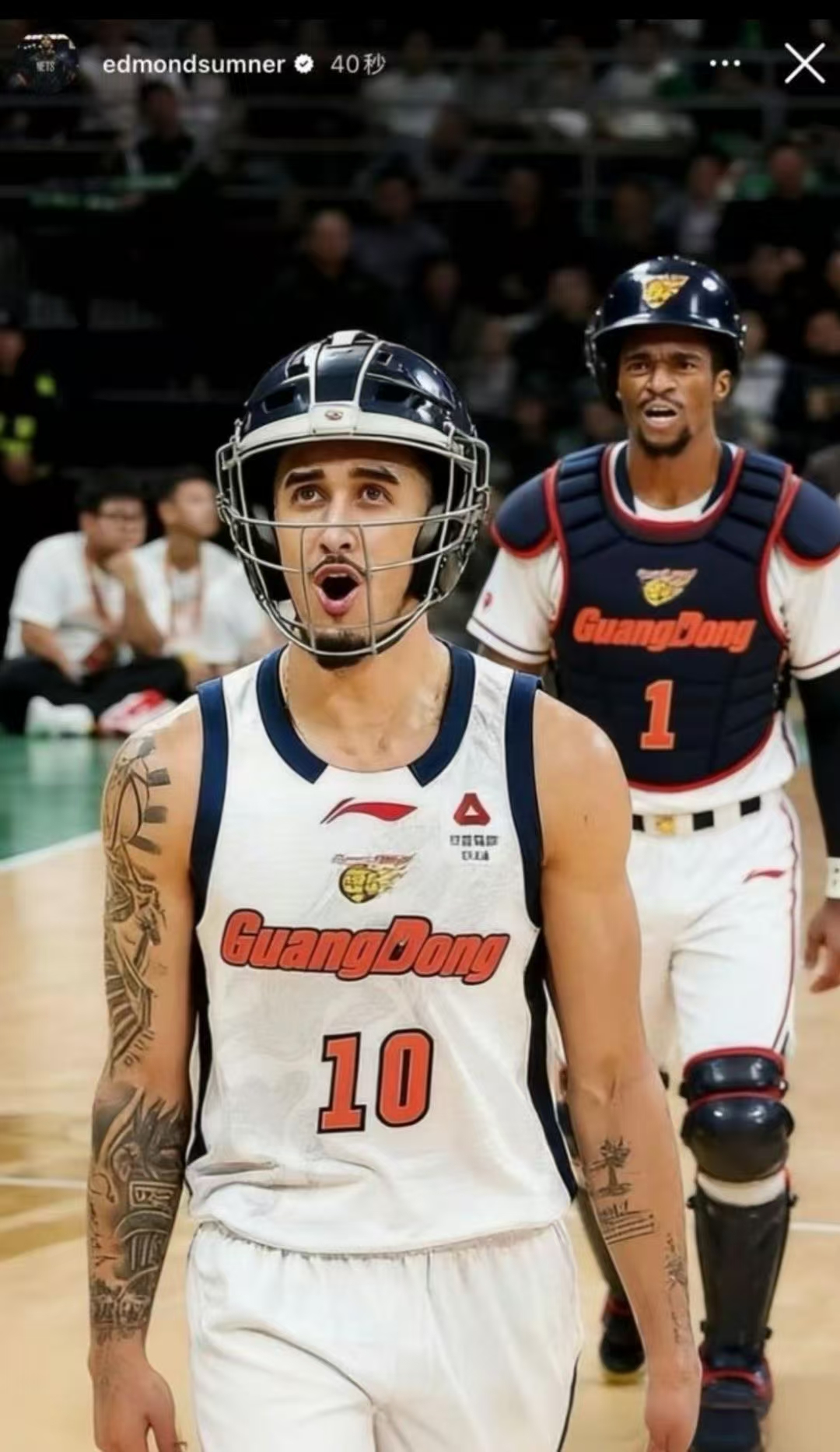 迪亚洛赛后也在社交媒体上发言,表示他这辈子没经历过这种事。广东的萨姆纳和奎因更加搞笑,直接发了一个AI合成带头盔的图片,讽刺意义拉满。这场表现出色的王少杰也发了动态,没想到这场比赛赛后还这么精彩。