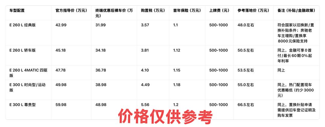 上周抽时间逛了几家奔驰4S店,专门了解了2026款E级的价格情况,从入门款到中高配都逐一问了细节,整理出一份行情参考。作为豪华中大型车的热门款,奔驰E级的价格波动和补贴政策一直受关注,这次探店也摸清了当前的市场情况。 ⬇️⬇️⬇️ 2026款奔驰E级的官方指导价区间很明确,从42.99万到59.98万不等。入门的E 260 L经典版指导价42.99万,比2025款改款车型降了2万多,算是官方让利的诚意。往上走,E 260 L轿车版45.18万,4MATIC四驱版47.78万,而主力销售的E 300 L时尚型和运动版都是49.98万,顶配的E 300 L尊贵型则到了59.98万,不同配置的价格梯度很清晰。 ⬇️⬇️⬇️ 终端现金优惠是大家最关心的,目前市场上的优惠力度比较统一,多数配置能谈到11万左右的优惠。比如E 260 L经典版优惠后裸车价大概31.99万,E 300 L时尚型优惠后在38.98万上下,顶配车型优惠后也能降到48.98万。不过销售也提到,现车和订车的优惠略有差异,热门颜色的现车优惠可能少几千,但整体浮动不大。 ⬇️⬇️⬇️ 补贴政策方面,目前主要有国家以旧换新补贴和品牌自身的置换福利。国家层面,报废旧车再购买能拿到最高1.5万补贴,单纯置换旧车则最高1.3万,这个补贴只针对2.0升及以下排量的燃油版,正好覆盖奔驰E级的主力车型。另外,要是之前是奔驰车主,置换或者增购还能享8000元的保险支持,这个政策到2月底之前都有效。 ⬇️⬇️⬇️ 购车的附加费用也得算清楚。购置税是固定支出,按优惠后的裸车价除以1.13再乘以10%计算,E 260 L优惠后购置税大概3.57万,E 300 L则在4.49万左右。首年保险费用基本在1.1万到1.2万之间,包含交强险和常用的商业险,上牌费各地差异不大,一般500到1000元就能搞定。这样算下来,E 260 L经典版落地价大概48万左右,E 300 L时尚型落地则在55万上下。 ⬇️⬇️⬇️ 金融政策方面,目前有0首付或者最长60期的还款方案,年利率0%起,对于想分期的消费者来说压力不算大。不过贷款购车和全款在优惠幅度上没有区别,主要差异就是利息支出。 ⬇️⬇️⬇️ 整体来看,2026款奔驰E级的价格门槛比之前降低了,官方降价加上终端优惠,让入门款的性价比提升不少。补贴政策虽然有条件限制,但确实能帮消费者省一笔钱。建议大家购车时多对比几家门店的优惠细节,尤其是置换补贴的具体要求,避免后期出现纠纷。对于预算充足的消费者,中高配车型的优惠后价格也比较有吸引力,整体行情处于比较稳定的状态,短期内应该不会有太大波动。 (内容仅供参考,具体详情请咨询当地经销商)【来自懂车帝车友圈】