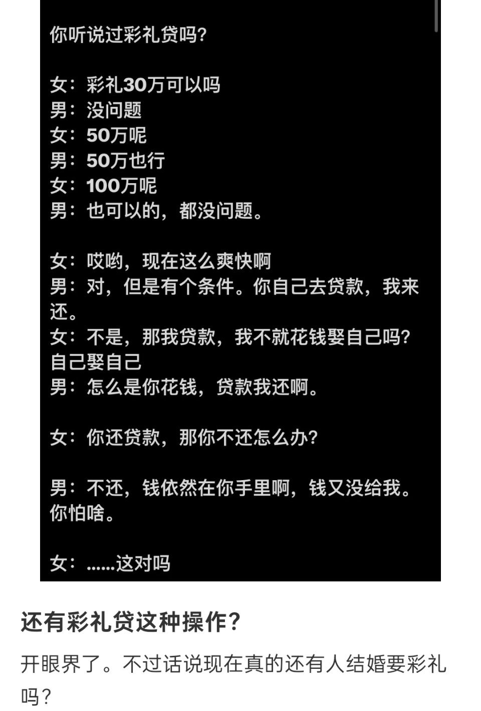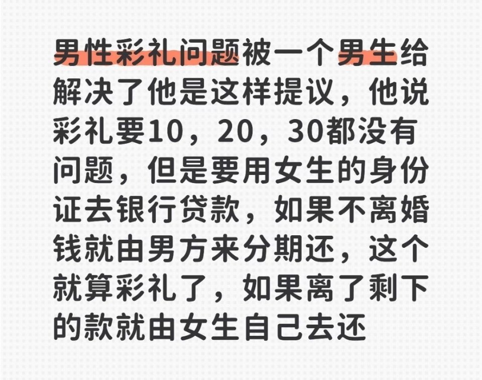 彩礼背后隐藏的化债问题如何避免彩礼化债?有人提出一个观点,那就是彩礼贷,女方向银行申请30万作为彩礼,男方负责分期还。