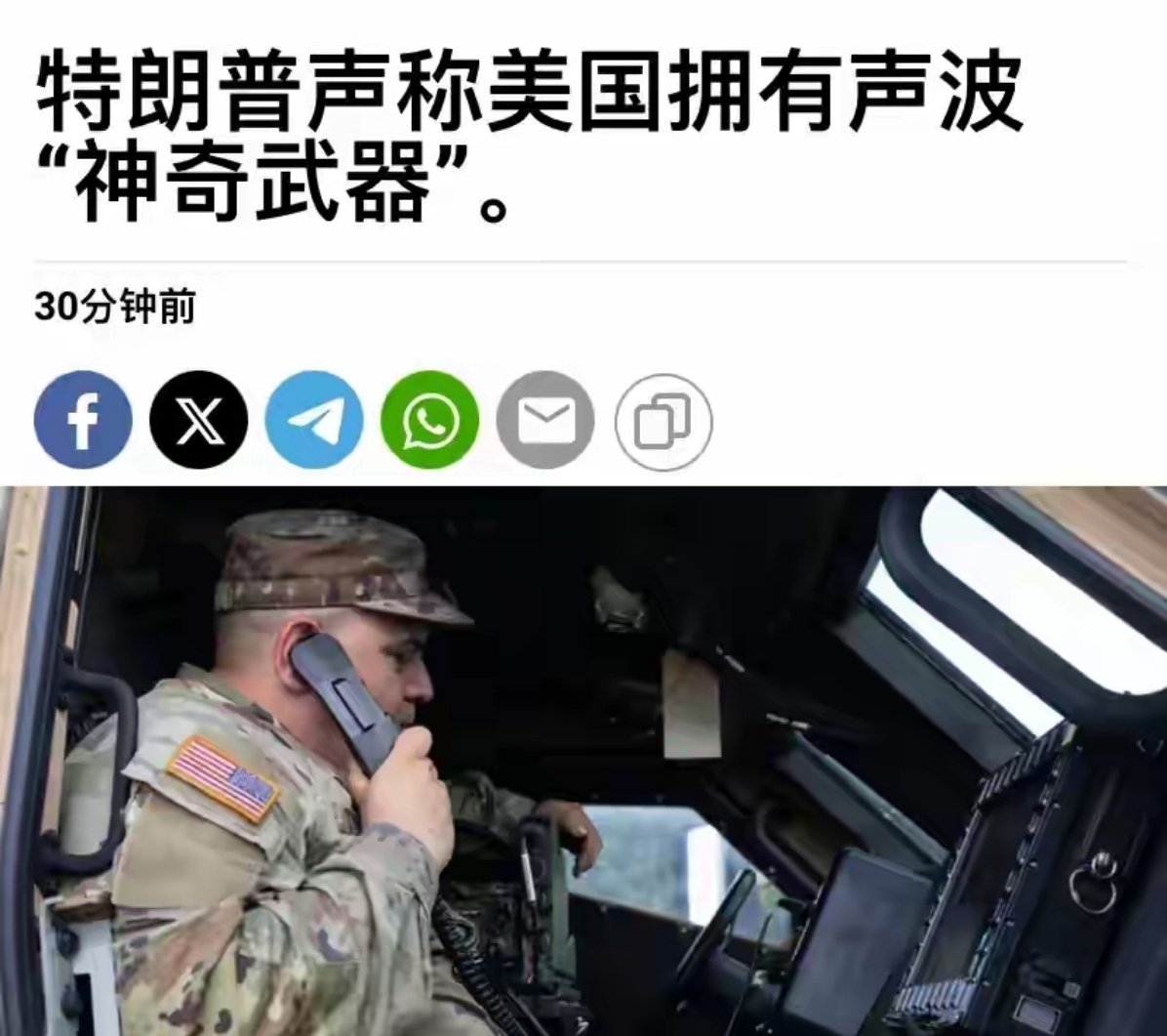 特朗普声称美国有秘密声波武器美国总统特朗普承认,美国军方在绑架委内瑞拉总统马杜罗期间使用了“秘密声波”武器,被攻击的人头疼欲裂、口鼻出血,当场丧失战斗的能力。所以无论武功有多强,训练素质有多么强劲,在这种武器攻击面前会迅速丧失战斗力,今后可否恢复都是个大问题。是不是《绿巨人》中的那款?