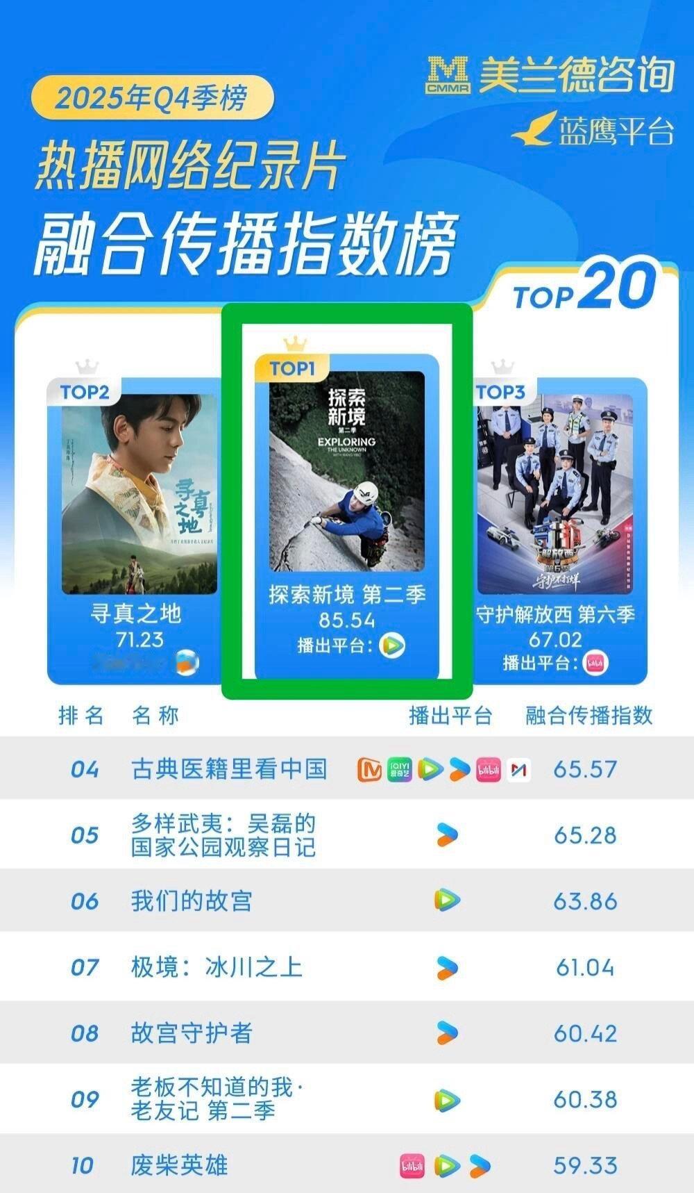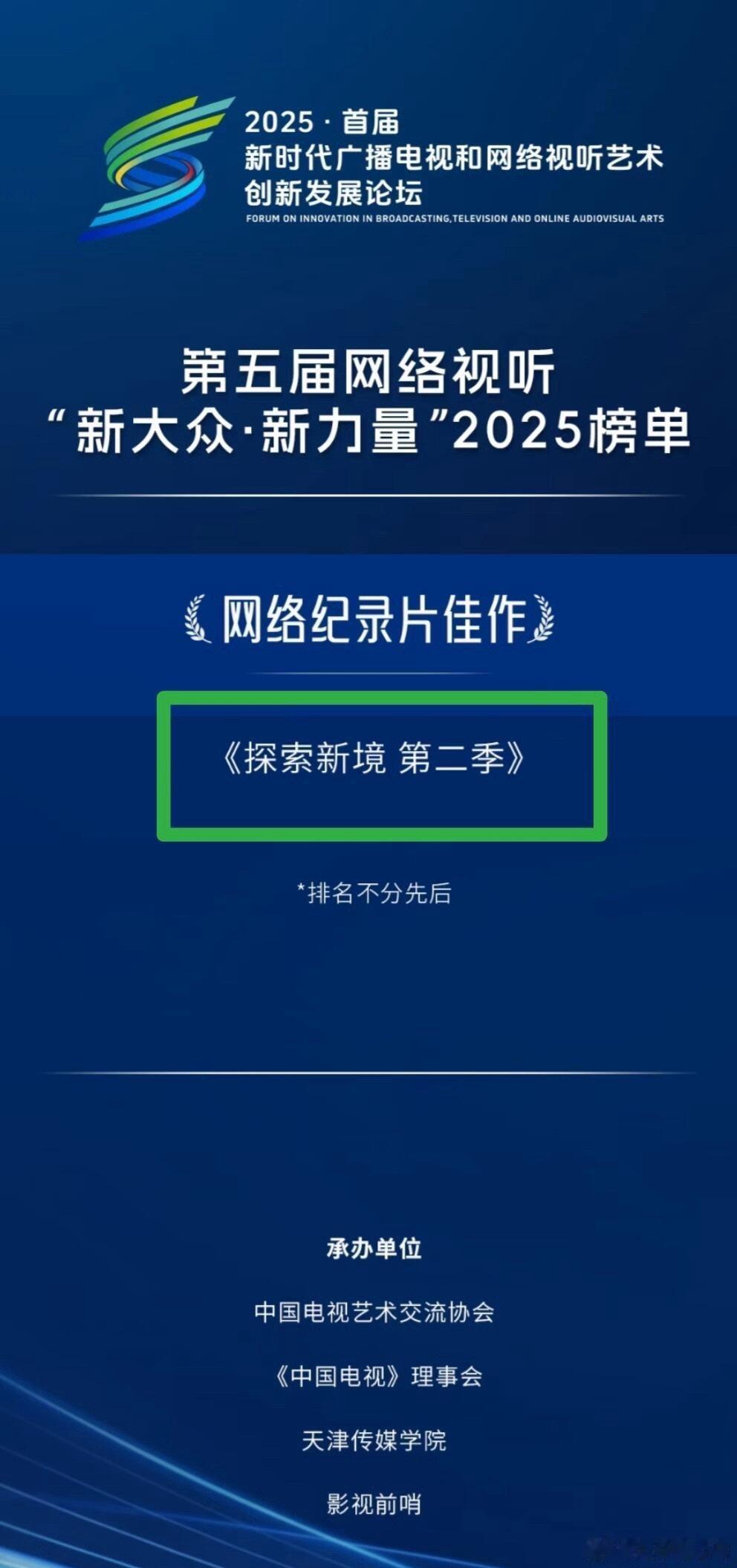 恭喜王一博发起的个人ip纪录片《探索新境》第2季收官至今不足一个月已荣获以下荣誉:🏆美兰德2025年度网络纪录片融合传播指数TOP1;🏆《博客天下》“2025博娱年度推选”年度户外纪录片;🏆2025腾讯视频金鹅荣誉年度纪录片及年度会员挚爱纪录片;🏆第五届网络视听“新大众·新力量”佳作榜单! 探索新境2