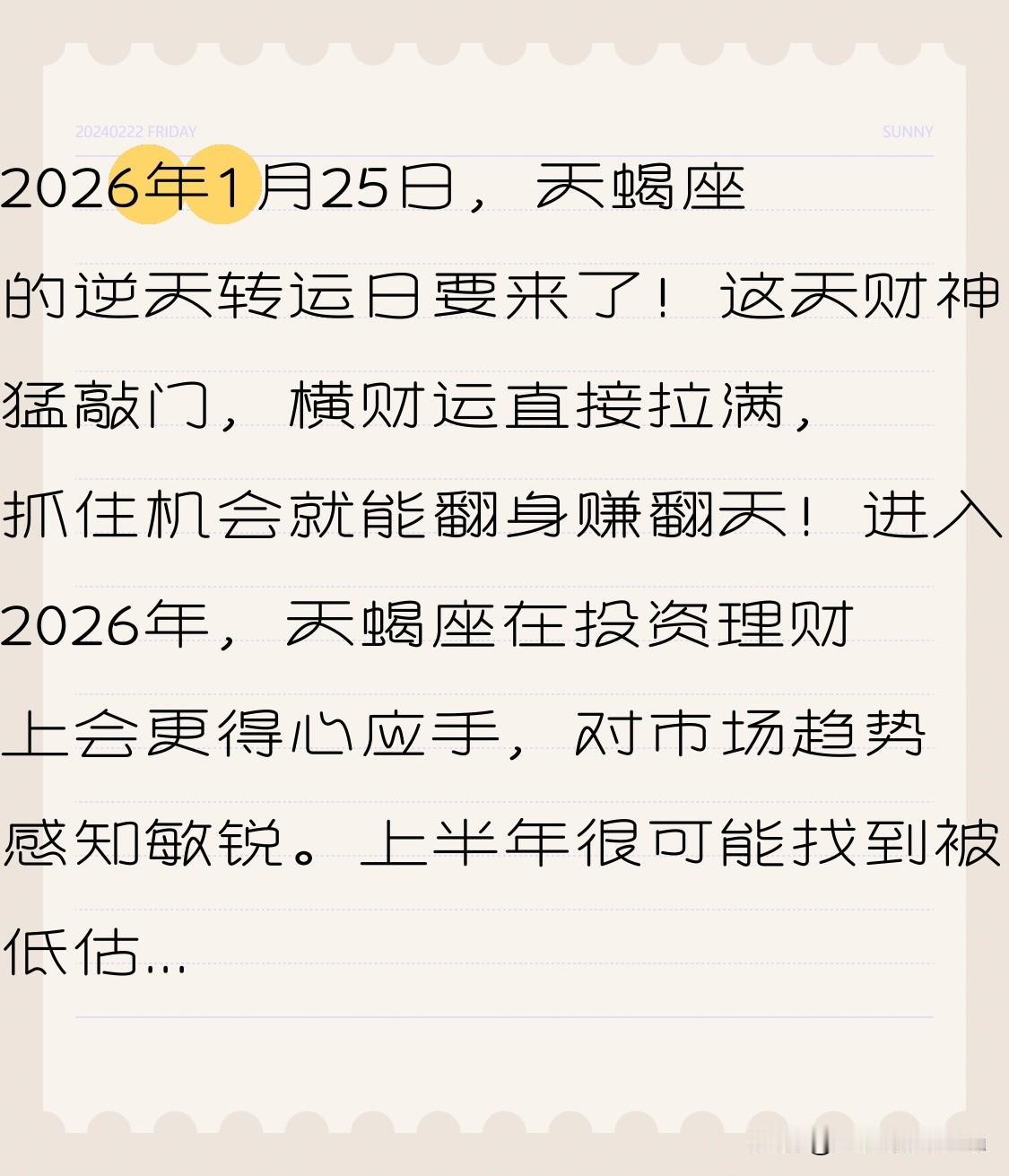 2026年1月25日,天蝎座的逆天转运日要来了!这天财神猛敲门,横财运直接拉满,抓住机会就能翻身赚翻天! 进入2026年,天蝎座在投资理财上会更得心应手,对市场趋势感知敏锐。上半年很可能找到被低估资产或新兴领域的机会,像科技和资源相关行业,收益相当可观。部分天蝎还能通过副业、技能变现或过往投资收获回报。 事业上也有大突破,很可能负责重要项目,成为团队核心。第一季度末,还有望升职或获重要职责授权,收入自然水涨船高。不过,做决策时得冷静分析,别冲动坏了计划。天蝎们,准备好迎接这波好运了吗?