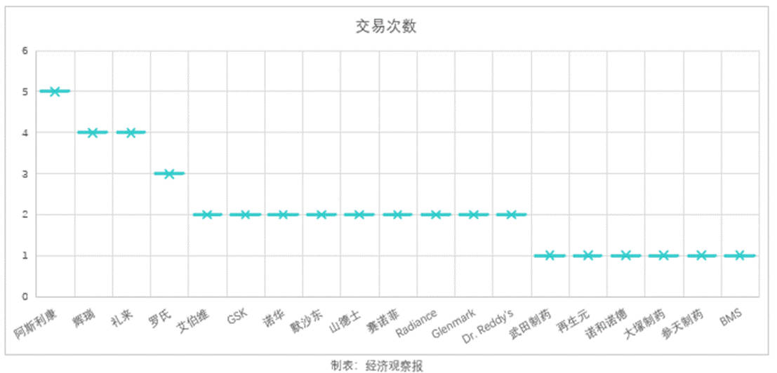 美国药企辉瑞、礼来亦频频出手,分别进行了4次交易。
