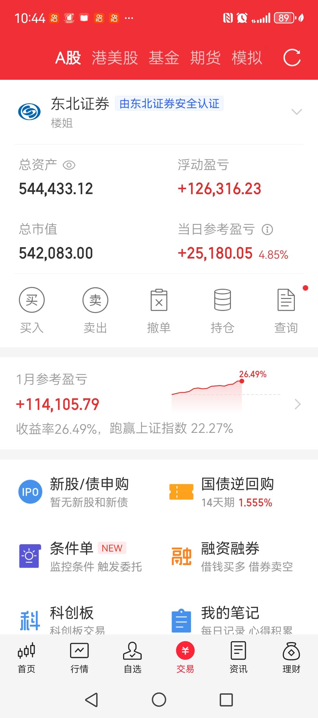 看得到的数据,只能从2022年起,账户收益率是接近350%。事实上,账户的收益率远高于此。 因为,2019年的时候账户只有5万块钱,现在已经接近55万。也就是说,最近6年,真正的收益率是接近1000%。 账户1月份以来,收益率接近27%,非常可观。整个收益曲线,陡然向上,和现在的市场横盘震荡形成非常鲜明的对比。 同样难得可贵的是,账户从2021年9月份之后,就没有再出现过卖出方面的亏损。你所看到的震荡或者下降曲线都是2021年9月份之前不恰当的买入造成的。 2024年之后,我的理念是,好价钱买入好股票,不赚钱不卖,甚至不赚大钱不卖。 具体的说,就是择时买入处于上升趋势,且相对低位,交易相对活跃的主流行业的核心龙头个股不赚钱不卖,甚至不赚大钱不卖。